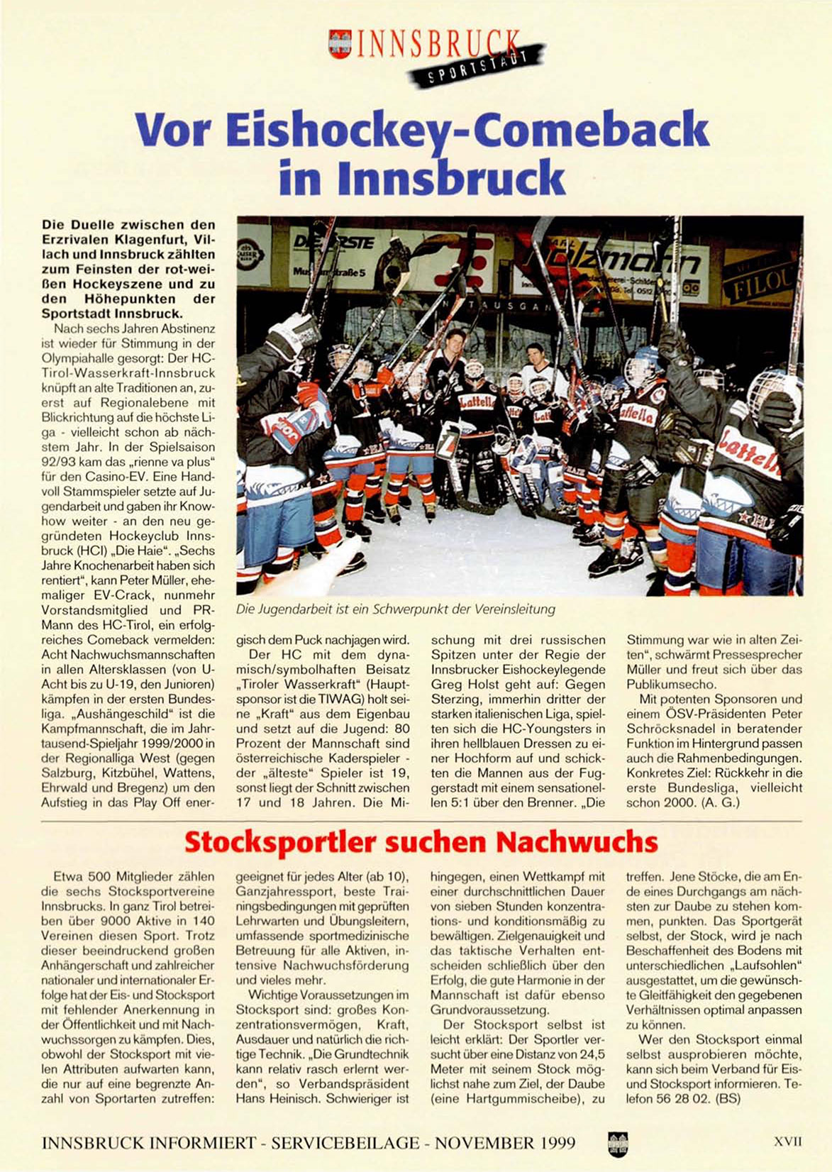 für den Casino-EV. Eine Handvoll Stammspieler setzte auf Jugendarbeit und gaben ihr Knowhow weiter - an den neu gegründeten Hockeyclub Innsbruck (HCI) „Die Haie". „Sechs