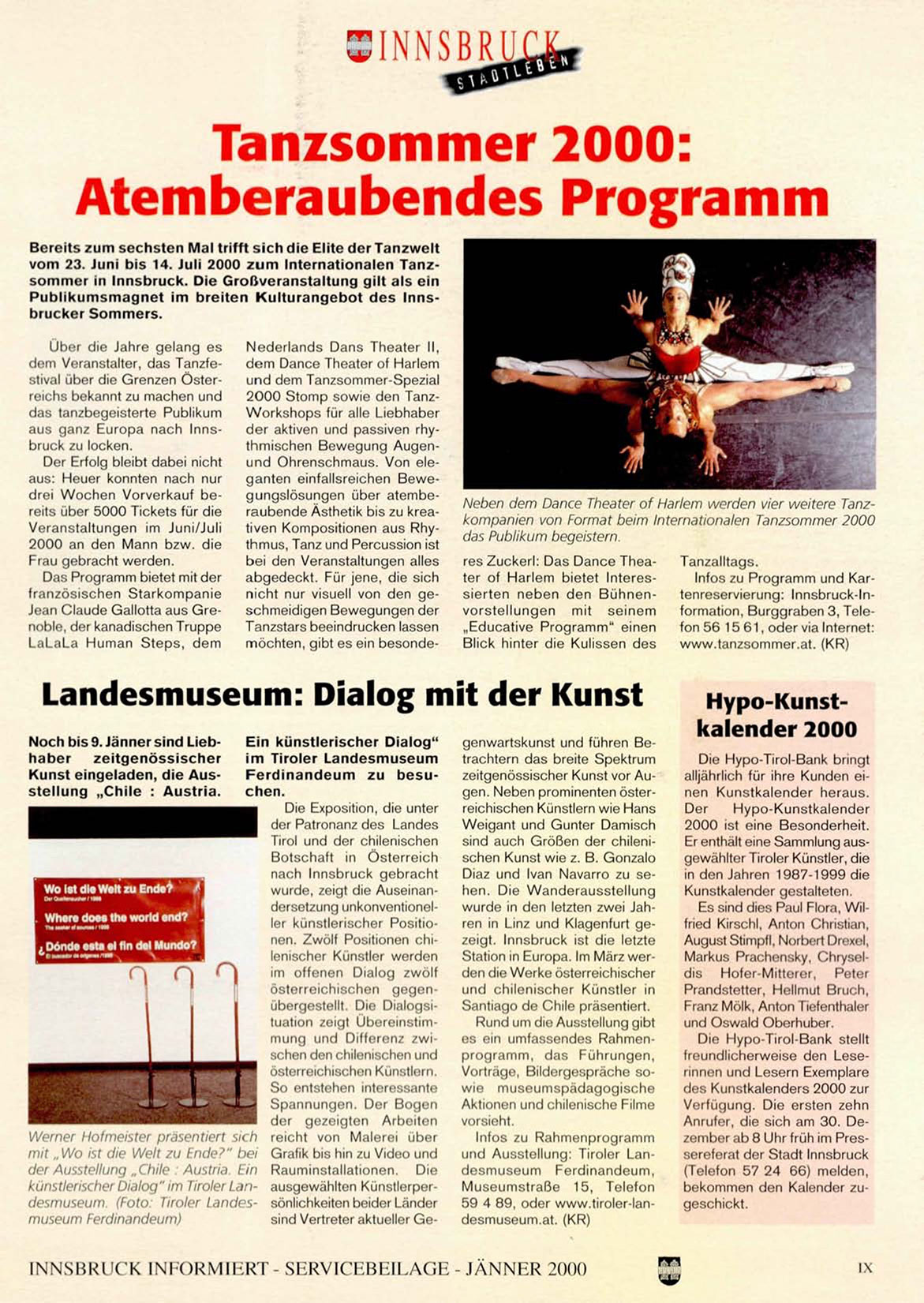 v o m 23. Juni bis 14. Juli 2000 z u m I n t e r n a t i o n a l e n Tanzs o m m e r in I n n s b r u c k . Die G r o ß v e r a n s t a l t u n g gilt als ein
