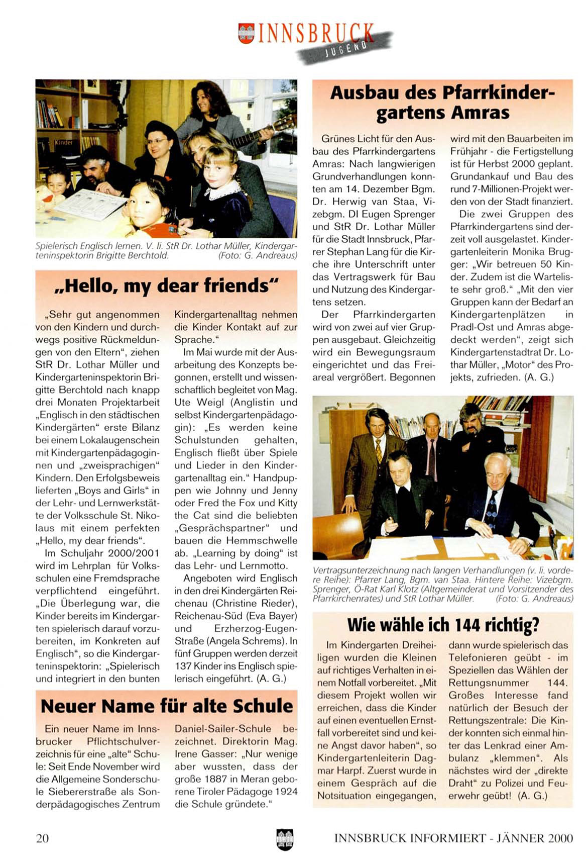 zeit voll ausgelastet. Kinderfür die Stadt Innsbruck, PfarSpielerisch Englisch lernen. V. li. StR Dr. Lothar Müller, Kindergargartenleiterin Monika Brugrer Stephan Lang für die Kirtcninspektorin Brigitte Berchtold.