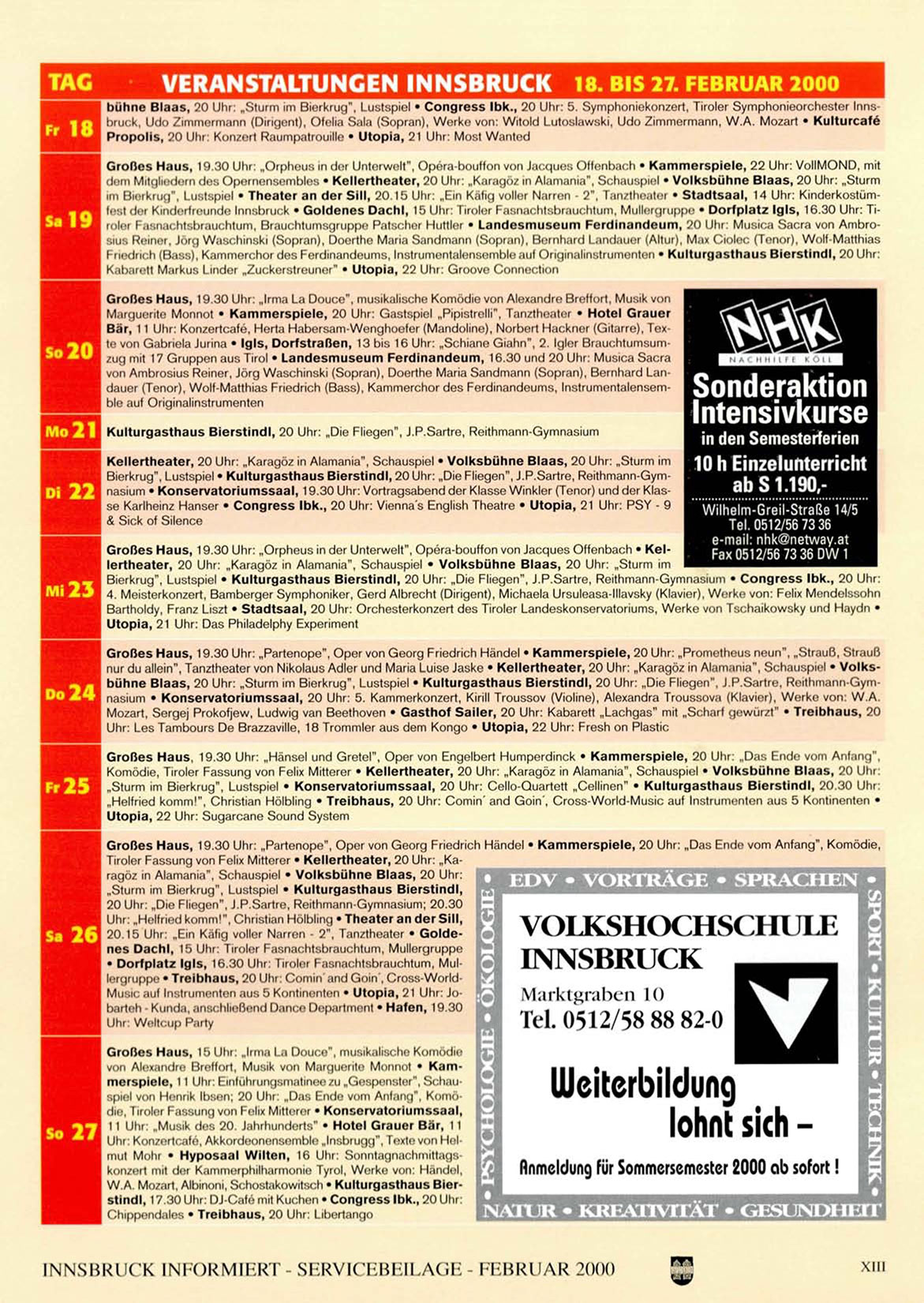 Bierkrug", Lustspiel • K u l t u r g a s t h a u s B i e r s t i n d l , 20 Uhr: „Die Fliegen", J.P.Sartre, Reithmann-Gymnasium • C o n g r e s s Ibk., 20 Uhr: