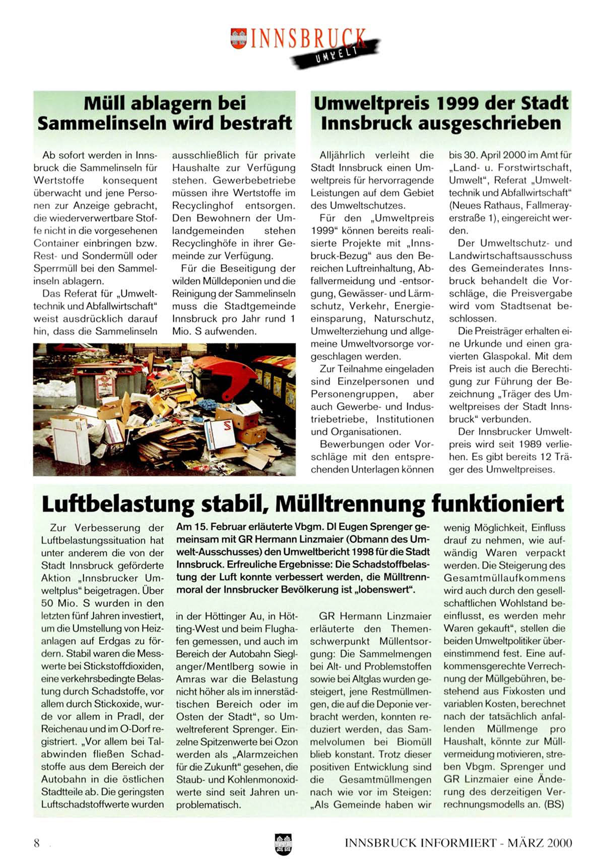 1999" können bereits realisierte Projekte mit „Innsbruck-Bezug" aus den Bereichen Luftreinhaltung, Abfallvermeidung und -entsorgung, Gewässer- und Lärmschutz, Verkehr, Energieeinsparung, Naturschutz,