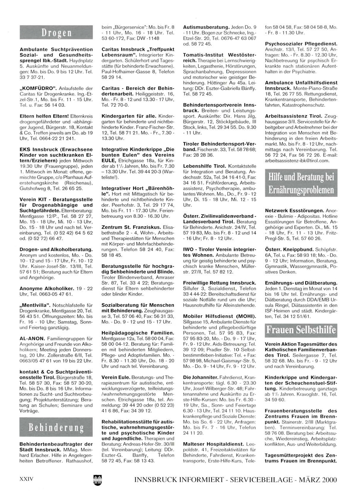 IWO - Tiroler V e r e i n i n t e g r i e r t e s W o h n e n . Ambulante Betreuung für geistig behinderte und psychisch kranke Menschen, Müllerstr. 27/II, Tel. 57 62 12.