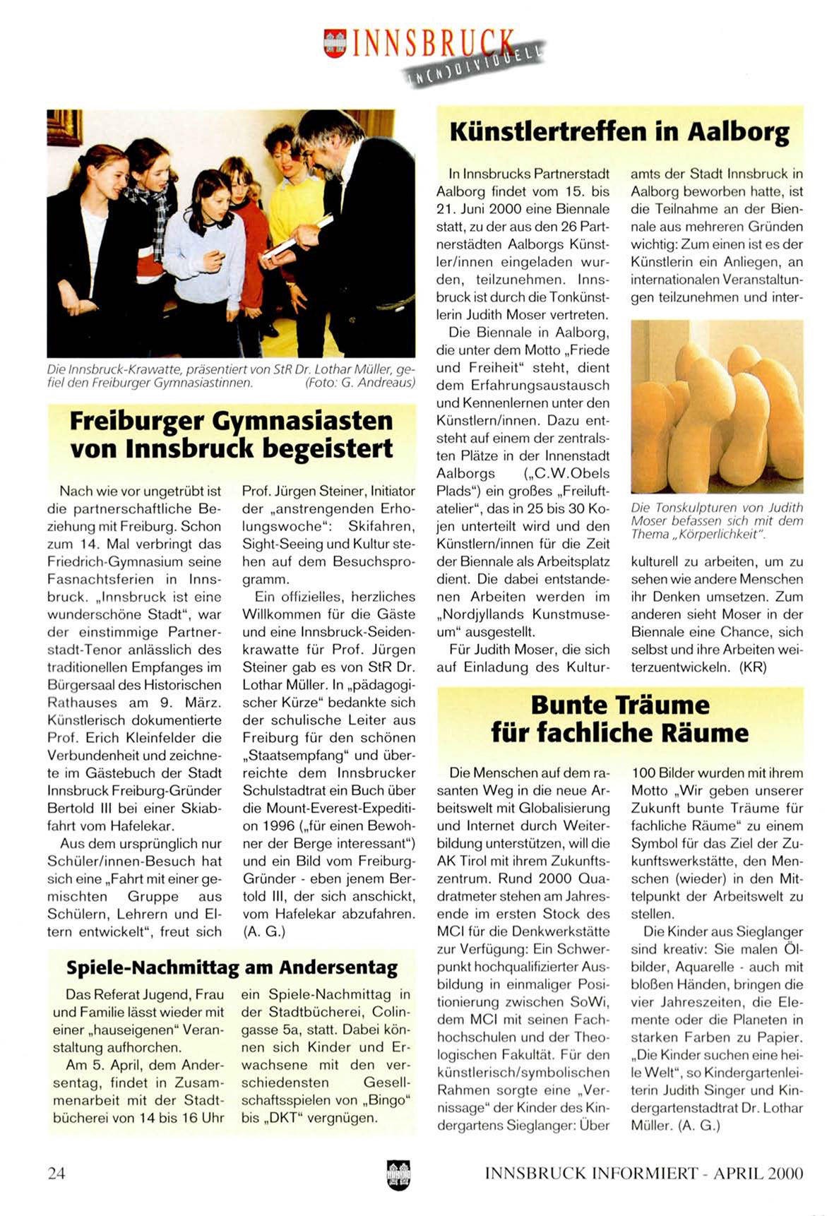 statt, zu der aus den 26 Partnerstädten Aalborgs Künstler/innen eingeladen wurden, teilzunehmen. Innsbruck ist durch die Tonkünstlerin Judith Moser vertreten.