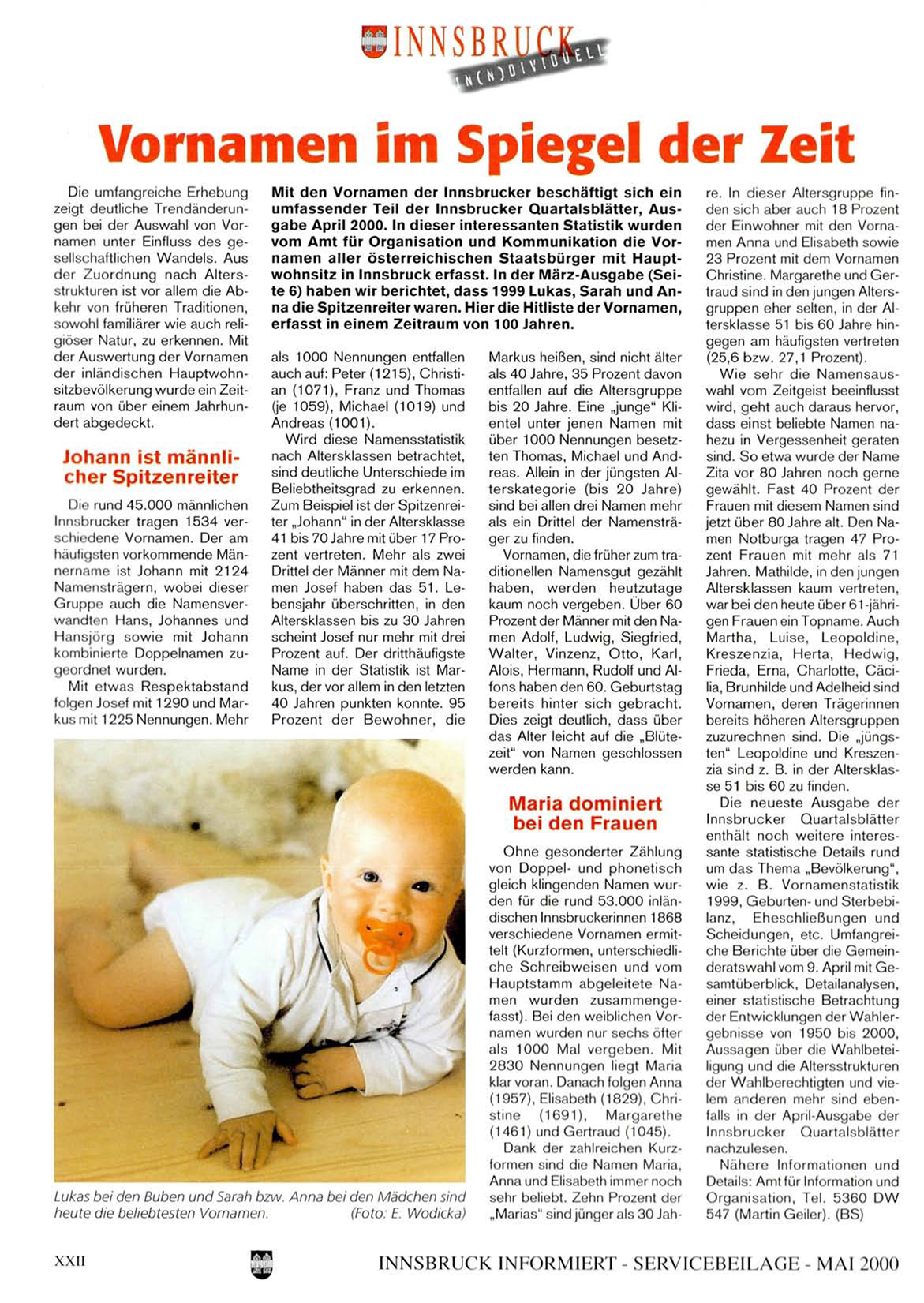 v o m A m t f ü r O r g a n i s a t i o n u n d K o m m u n i k a t i o n d i e Vornamen aller österreichischen Staatsbürger mit Hauptw o h n s i t z in I n n s b r u c k e r f a s s t . In der M ä r z - A u s g a b e (Seite 6) h a b e n w i r b e r i c h t e t , d a s s 1999 L u k a s , S a r a h u n d A n na d i e S p i t z e n r e i t e r w a r e n . Hier d i e Hitliste der V o r n a m e n ,