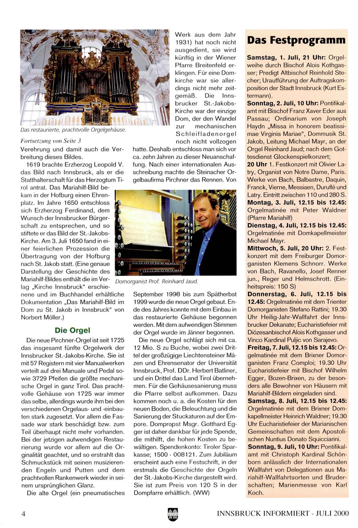 S a m s t a g , 1. Juli, 21 Uhr: Orgelweihe durch Bischof Alois Kothgasser; Predigt Altbischof Reinhold Stecher; Uraufführung der Auftragskomposition der Stadt Innsbruck (Kurt Estermann).