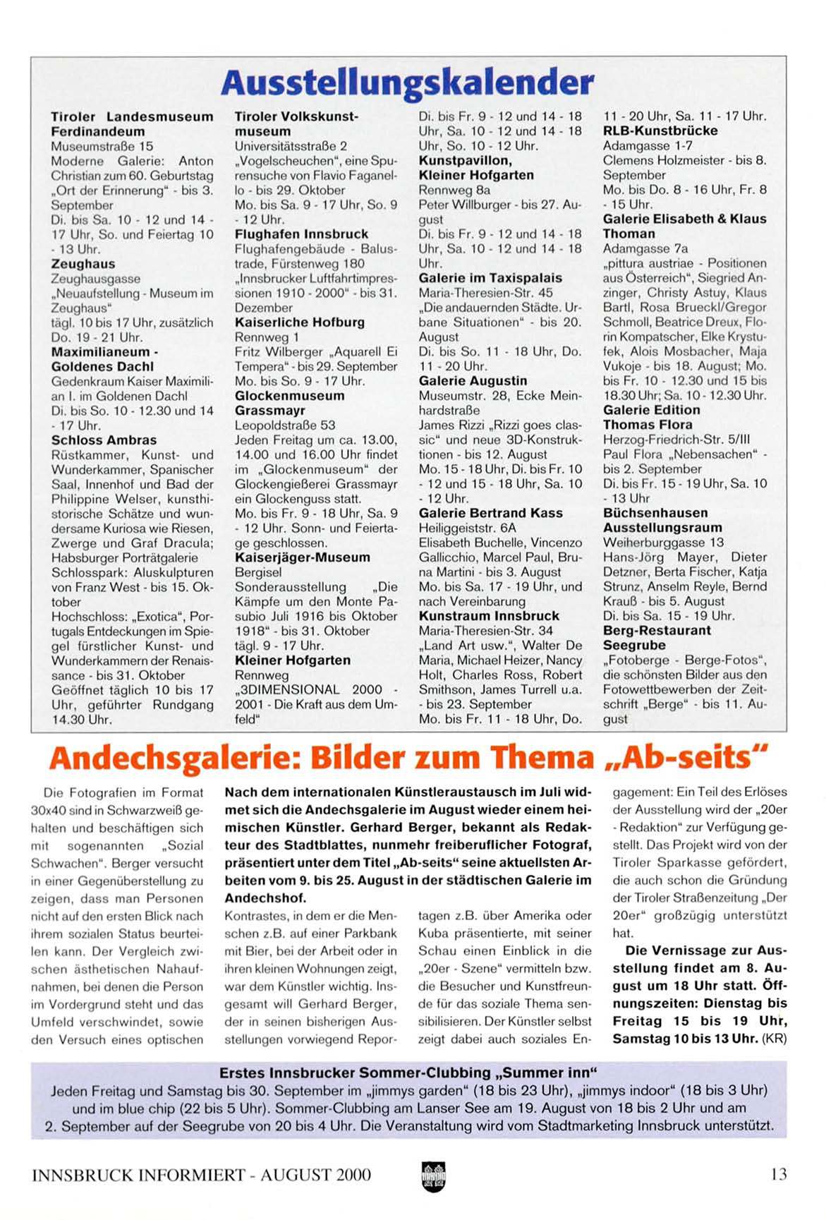 und im blue chip (22 bis 5 Uhr). S o m m e r - C l u b b i n g am Lanser S e e am 19. August von 18 bis 2 Uhr und am