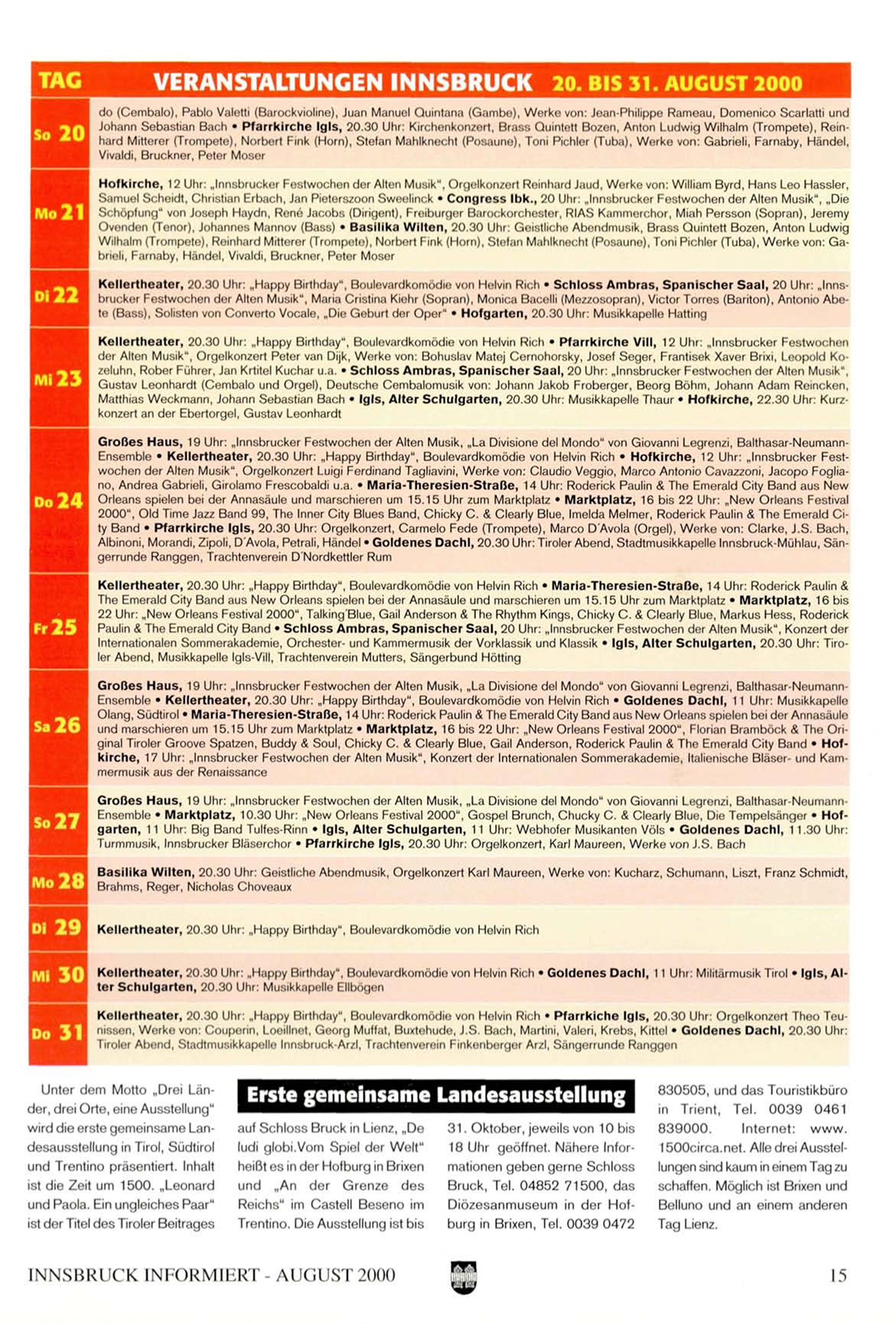 und marschieren um 15.15 Uhr zum Marktplatz » M a r k t p l a t z , 16 bis 22 Uhr: „New Orleans Festival 2000", Florian Bramböck & The Original Tiroler Groove Spatzen, Buddy & Soul, Chicky C. & Clearly Blue, Gail Anderson, Roderick Paulin & The Emerald City Band » Hofk i r c h e , 17 Uhr: „Innsbrucker Festwochen der Alten Musik", Konzert der Internationalen Sommerakademie, Italienische Bläser- und Kammermusik aus der Renaissance