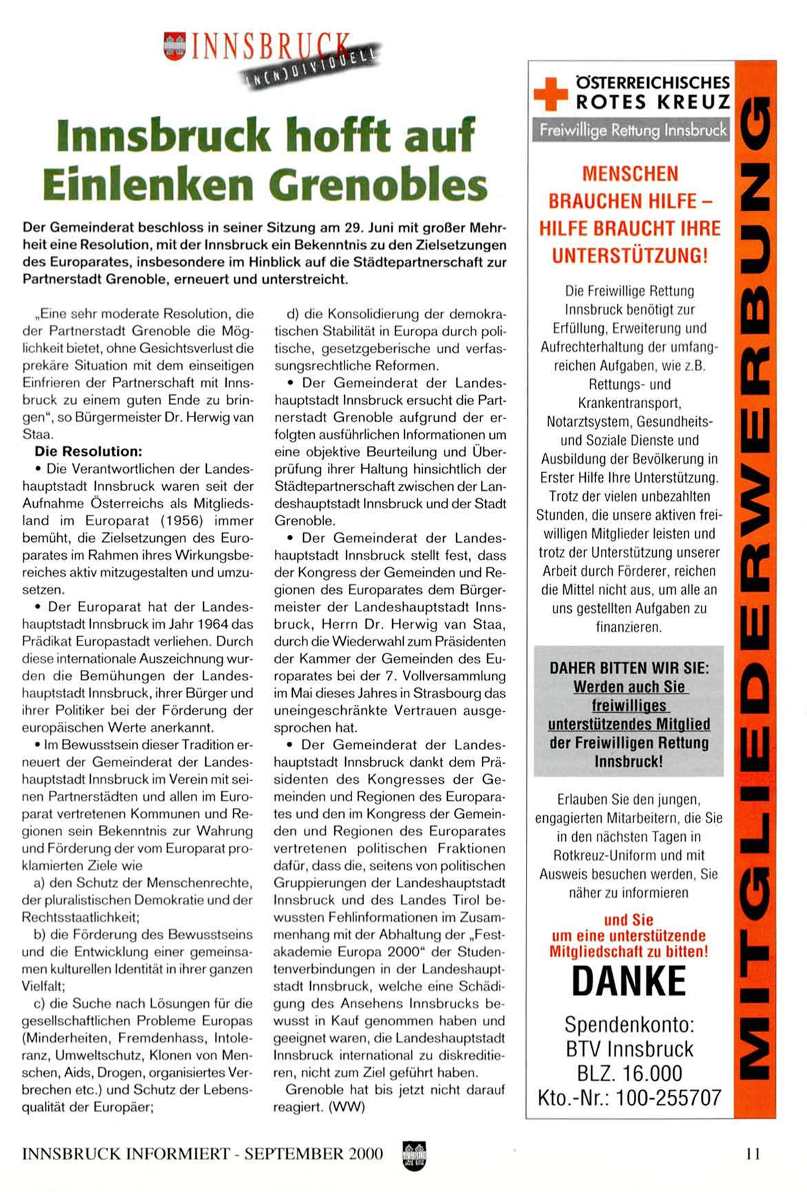 • Im Bewusstsein dieser Tradition erneuert der G e m e i n d e r a t der Landeshauptstadt Innsbruck im Verein mit seinen Partnerstädten und allen im Europarat vertretenen K o m m u n e n und Regionen sein Bekenntnis zur W a h r u n g