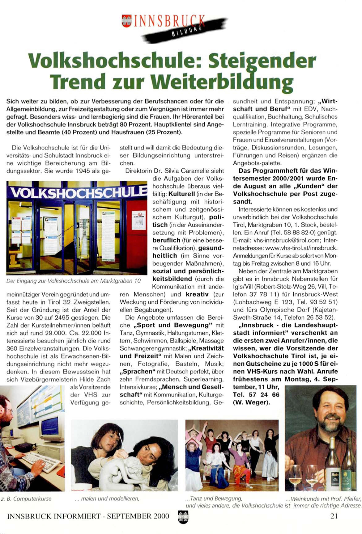 Die Volkshochschule ist für die Universitäts- und Schulstadt Innsbruck eine wichtige Bereicherung am Bildungssektor. Sie wurde 1945 als ge-