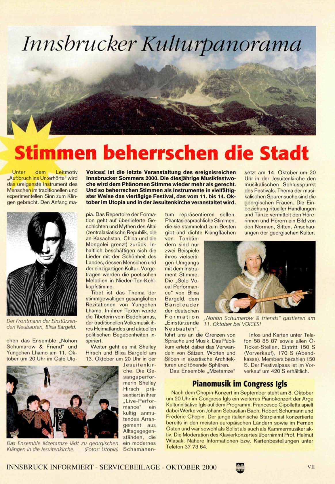Innsbrucker S o m m e r s 2000. Die d i e s j ä h r i g e M u s i k f e s t w o che w i r d d e m P h ä n o m e n S t i m m e w i e d e r mehr als gerecht.