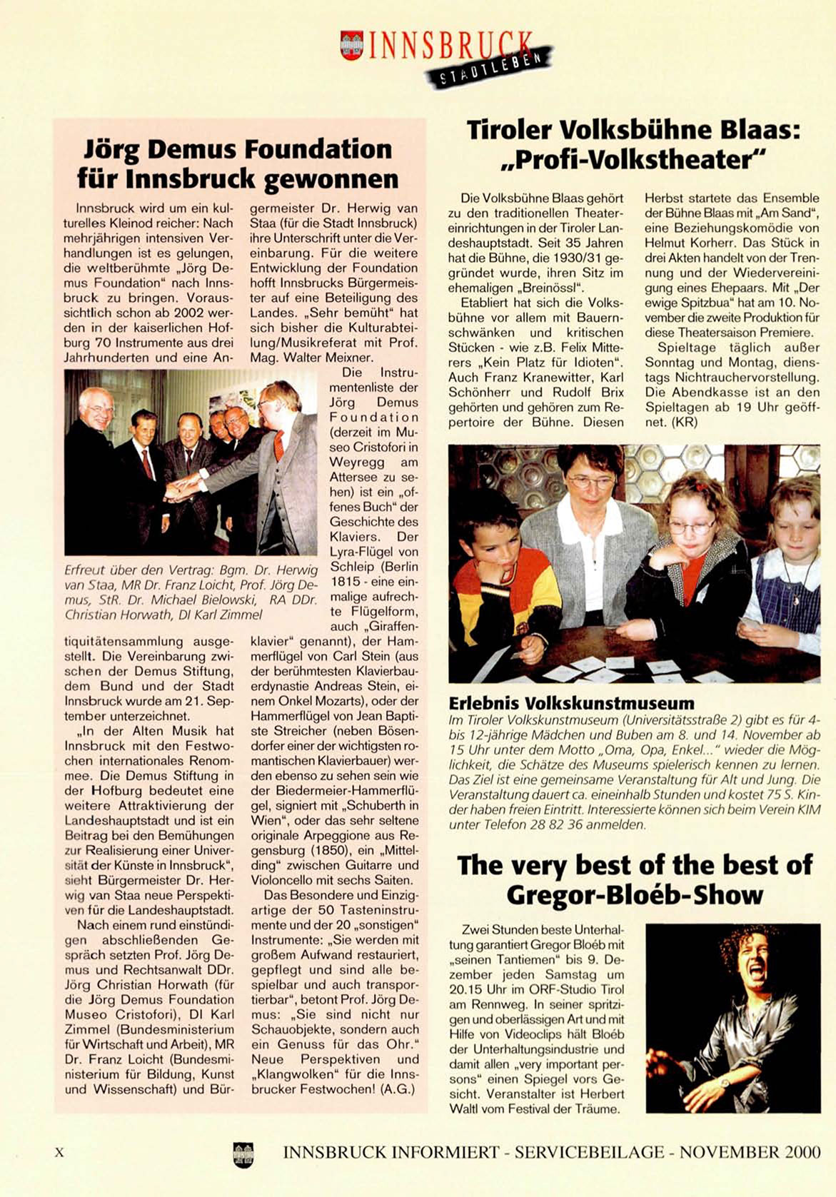 die weltberühmte „Jörg Demus Foundation" nach Innsbruck zu bringen. Voraussichtlich schon ab 2002 werden in der kaiserlichen Hofburg 70 Instrumente aus drei