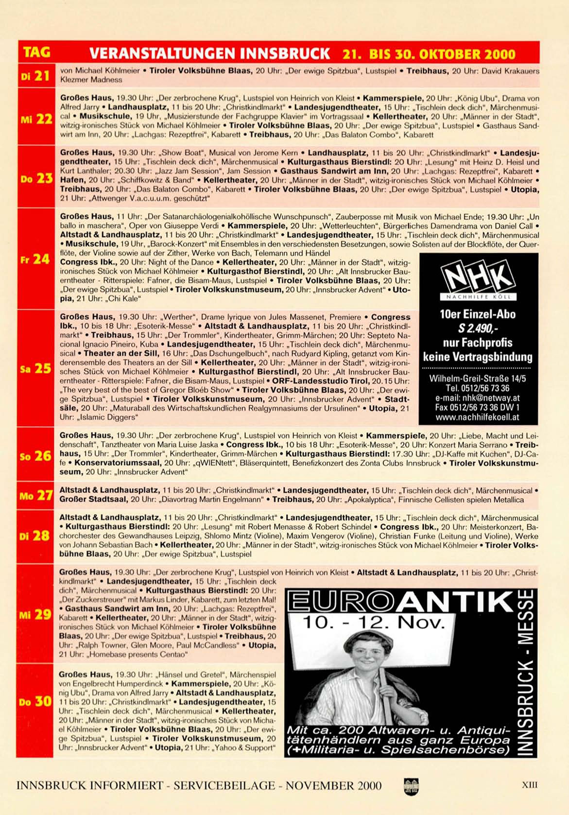 G r o ß e s H a u s , 19.30 Uhr: „Der zerbrochene Krug", Lustspiel von Heinrich von Kleist • K a m m e r s p i e r e , 20 Uhr: „Liebe, Macht und Leidenschaft", Tanztheater von Maria Luise Jaska • C o n g r e s s I b k . , 10 bis 18 Uhr: „Esoterik-Messe", 20 Uhr: Konzert Maria Serrano • T r e i b haus, 15 Uhr: „Der Trommler", Kindertheater, Grimm-Märchen » K u l t u r g a s t h a u s B i e r s t i n d l : 17.30 Uhr: „DJ-Kaffe mit Kuchen", DJ-Cafe • K o n s e r v a t o r i u m s s a a l , 20 Uhr: „qWIENtett", Bläserquintett, Benefizkonzert des Zonta Clubs Innsbruck » T i r o l e r V o l k s k u n s t m u s e u m , 20 Uhr: „Innsbrucker Advent"