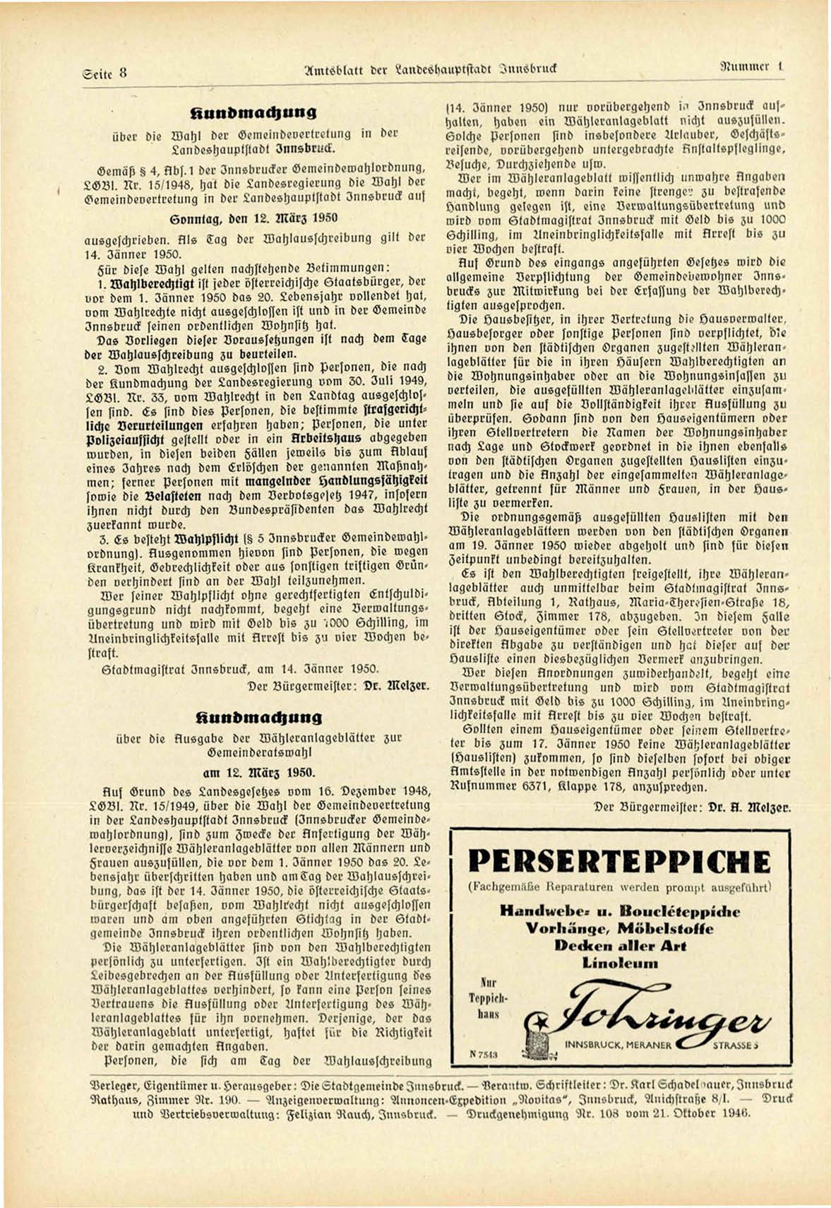 Stadtmagistrat Innsbruck, am 14. Jänner 1950.
