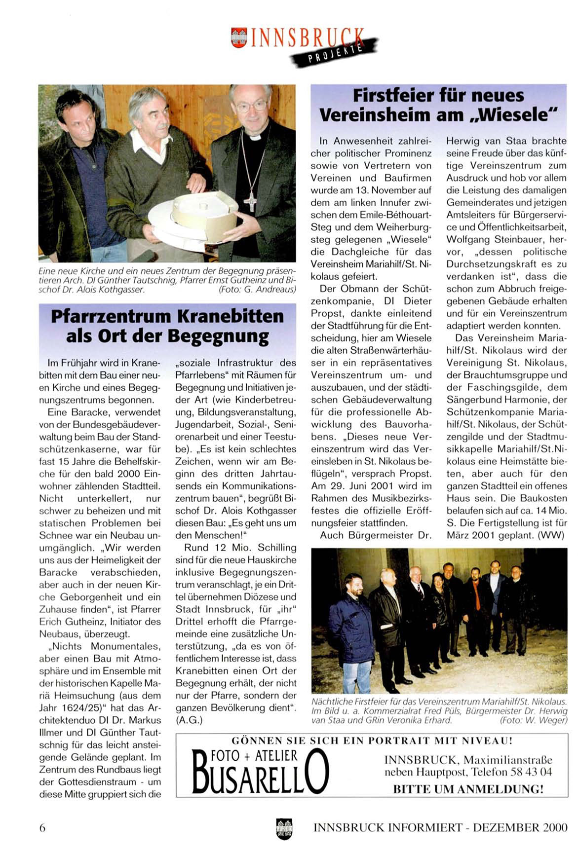 Im Frühjahr w i r d in Kranebitten mit dem Bau einer neuen Kirche und eines B e g e g nungszentrums begonnen.