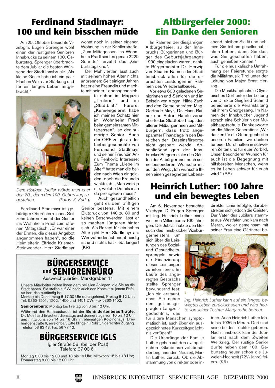 Innsbrucks zu seinem 100. Geburtstag. Sprenger überbrachte dem Jubilar die besten Wünsche der Stadt Innsbruck: „Als