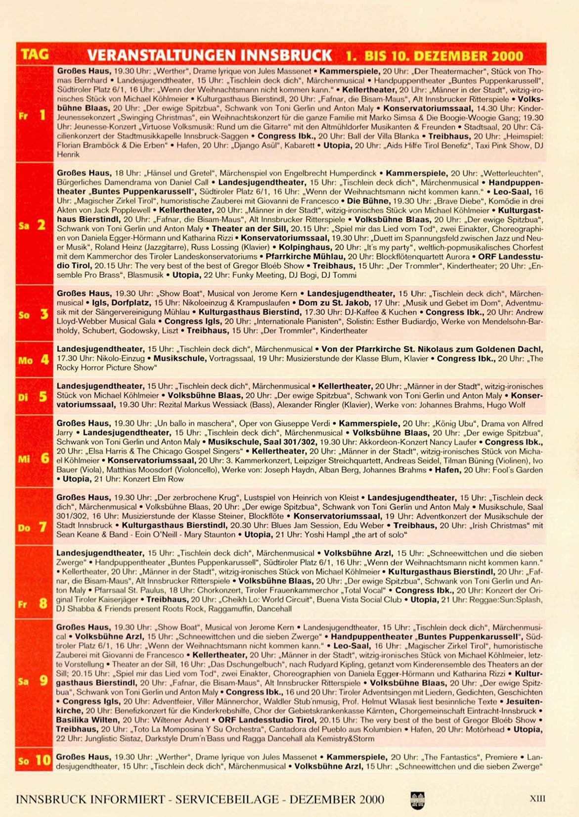 mit dem Kammerchor des Tiroler Landeskonservatoriums • P f a r r k i r c h e M ü h l a u , 20 Uhr: Blockflötenquartett Aurora • O R F L a n d e s s t u d i o T i r o l , 20.15 Uhr: The very best of the best of Gregor Bloéb Show • T r e i b h a u s , 15 Uhr: „Der Trommler", Kinderfheater; 20 Uhr: „Ensemble Pro Brass", Blasmusik • U t o p i a , 22 Uhr: Funky Meeting, DJ Bogi, DJ Tommi