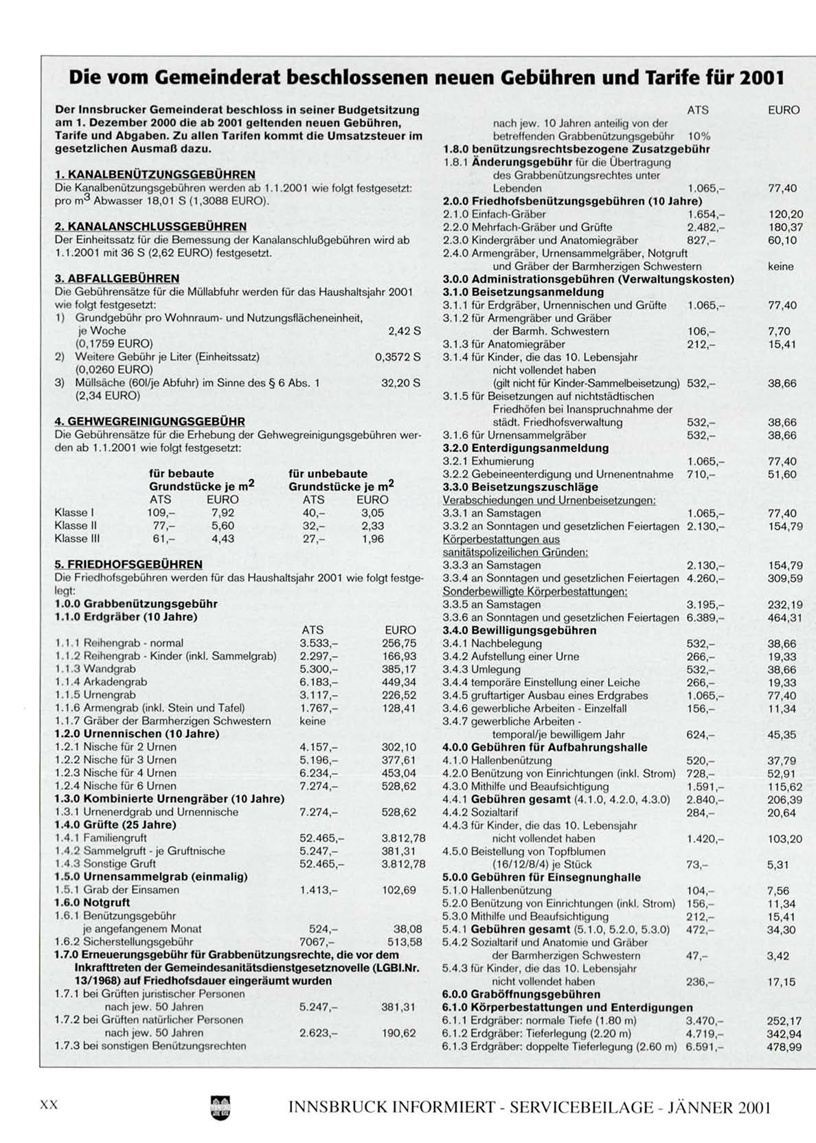 Die vom Gemeinderat beschlossenen neuen Gebühren und Tarife für 2001