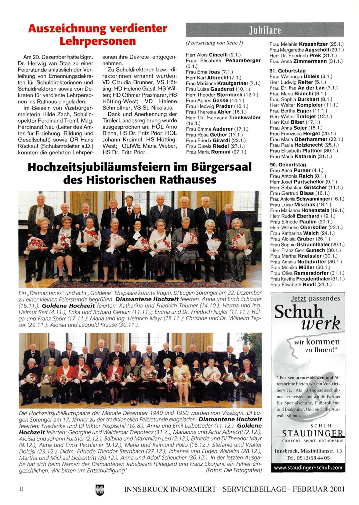 Helmut Reif (4.11.), Erika und Richard Genuin (11.11.); Emma und Dr. Friedrich Nigler (11.11.); Helga und Franz Spörr (17.11.); Maria und Ing. Heinrich Mayr (18.11.); Christine und Dr. Wilhelm Tepser (29.11.); Aloisia und Leopold Krause (30.11.).