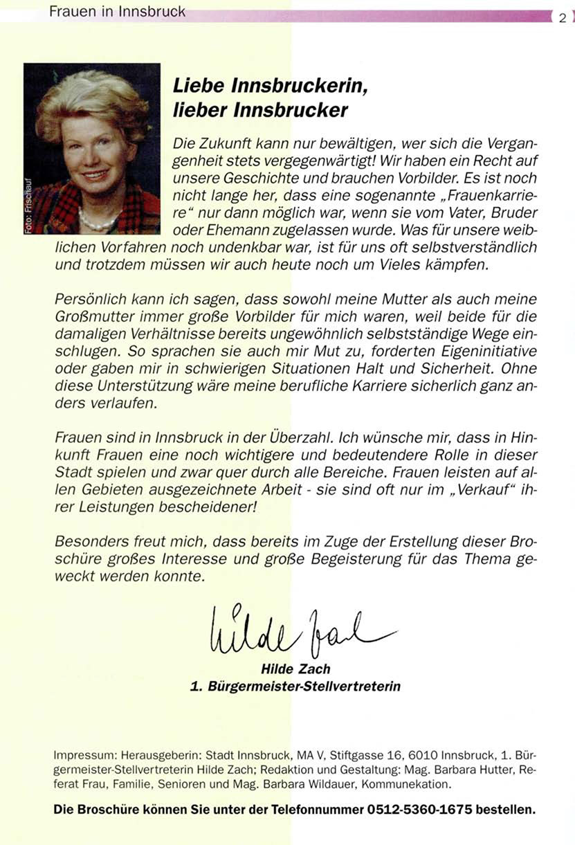 Impressum: Herausgeberin: Stadt Innsbruck, MA V, Stiftgasse 16, 6010 Innsbruck, 1. Bürgermeister-Stellvertreterin Hilde Zach; Redaktion und Gestaltung: Mag. Barbara Hutter, Referat Frau, Familie, Senioren und Mag. Barbara Wildauer, Kommunekation.