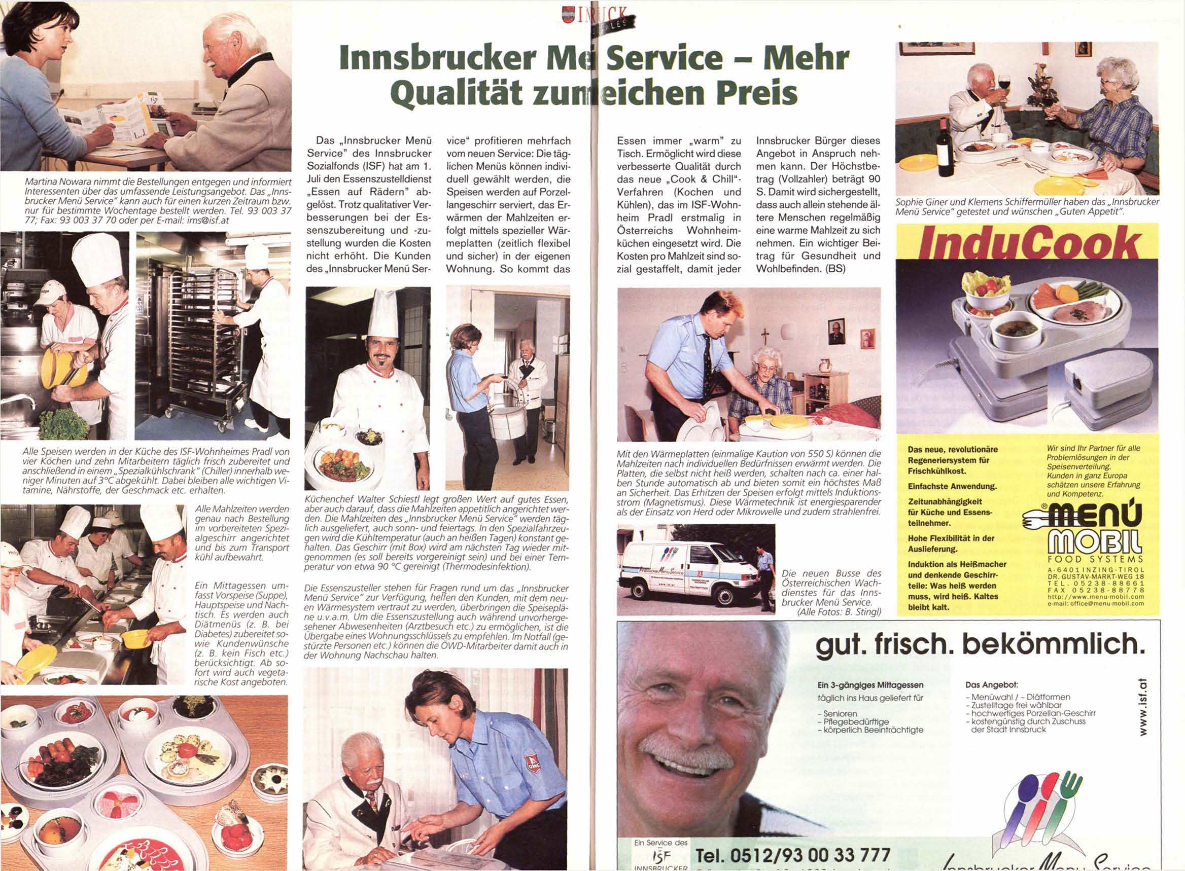 aber auch darauf, dass die Mahlzeiten appetitlich angerichtet werden. Die Mahlzeiten des „Innsbrucker Menü Service" werden täglich ausgeliefert, auch sonn- und feiertags. In den Spezialfahrzeugen wird die Kühltemperatur (auch an heißen Tagen) konstant gehalten. Das Geschirr (mit Box) wird am nächsten Tag wieder mitgenommen (es soll bereits vorgereinigt sein) und bei einer Temperatur von etwa 90 °C gereinigt