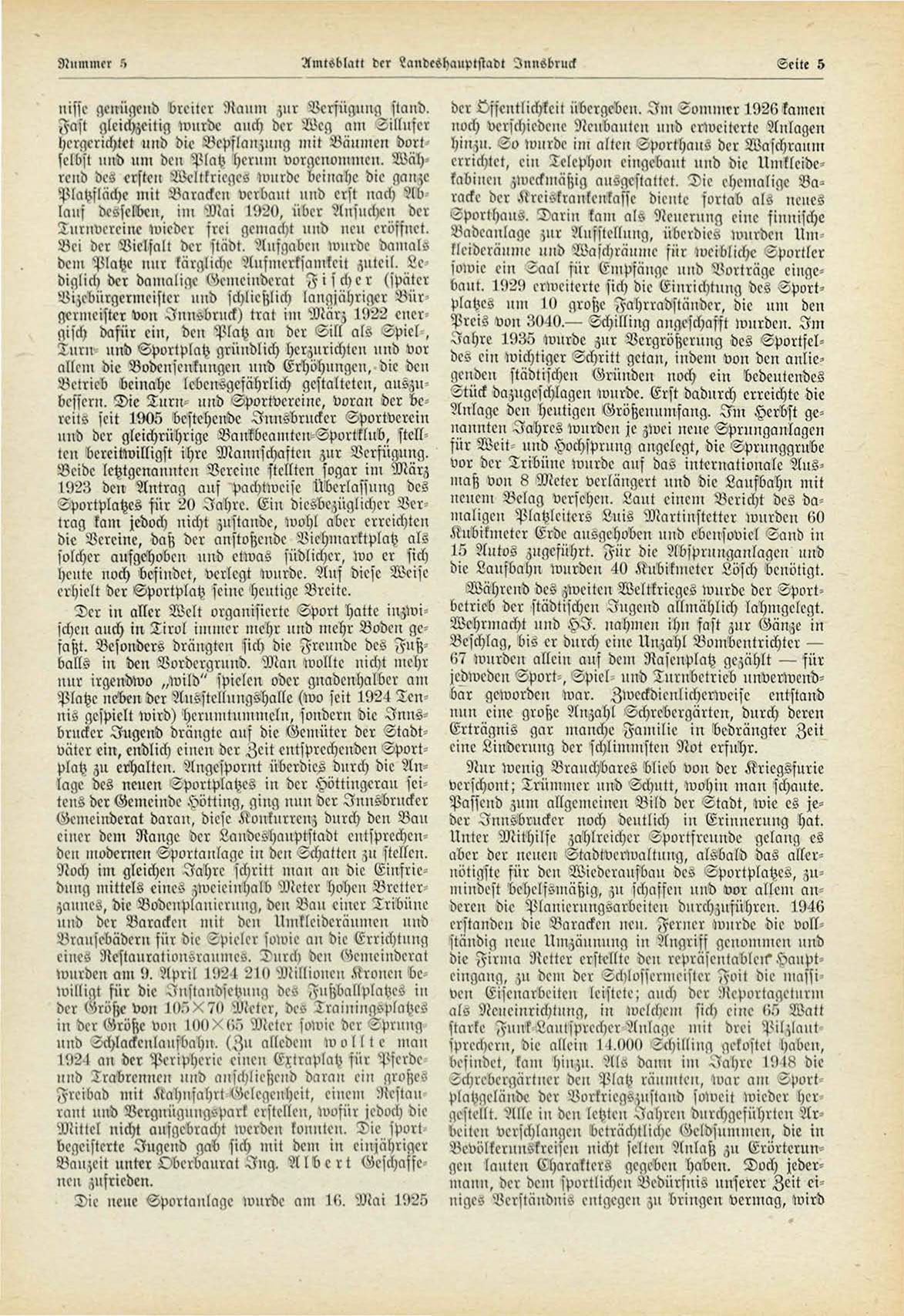 Platze neben der Ausstelluugshalle (wo seit 1924 Tennis gespielt wird) herumlummelu, sondern die I n n s bruckcr Jugend drängte anf die Gemüter der Stadtväter ein, endlich einen der Zeit entsprechenden Sportplatz zu erhalten. Angespornt überdies durch die A n lage des nenen Sportplatzes in der Höttiugerau seitens der Gemeinde Hotting, ging uuu der Junsbrucker
