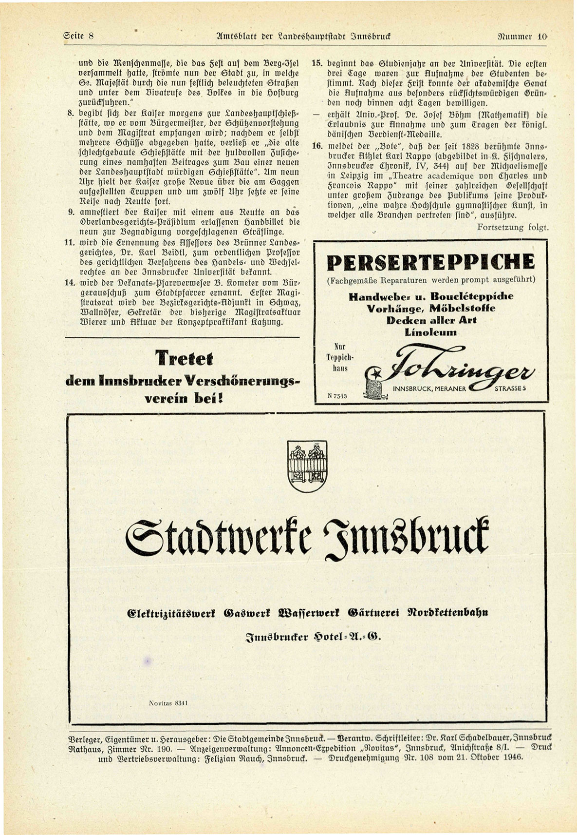 Verleger, Eigentümer u. Herausgeber i Die Stadtgemeinde Innsbruck. — Verantw. Schriftleiter ! Vr. «arl ^chndelbaner, Innsbruck
