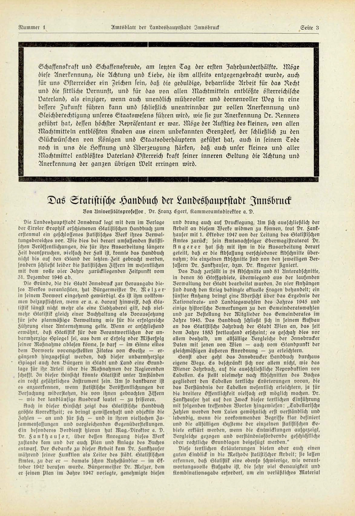 Die Gründe, die die Stadt Innsbruck Zur Herausgabe dieses Werkes vercmlasiten, hat Bürgermeister Dr. M e I z e rin seinem Vorwort eingehend gewürdigt. Es ist ihm uoükom»n"n beizupflichten, wenn er u. a. darauf hinweift, daß Statistik langst nicht mehr als eine Liebhaberei gilt, daft vielmehr Stalistik gleich einer Buchhaltung als Voraussehung