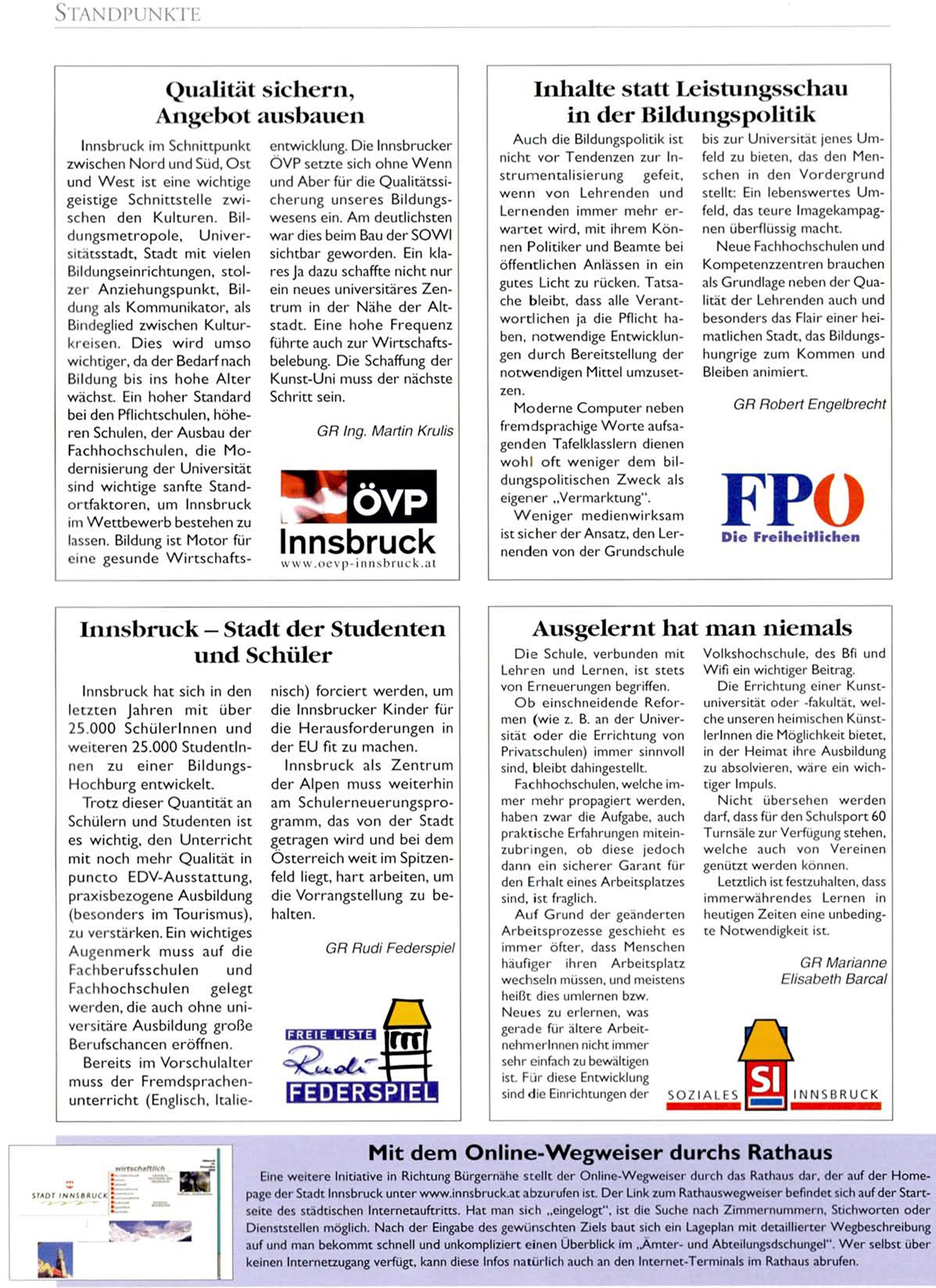 Eine weitere Initiative in Richtung Bürgernähe stellt der Online-Wegweiser durch das Rathaus dar, der auf der Homepage der Stadt Innsbruck unter www.innsbruck.at abzurufen ist. Der Link zum Rathauswegweiser befindet sich auf der Startseite des städtischen Internetauftritts. Hat man sich „eingelogt", ist die Suche nach Zimmernummern, Stichworten oder