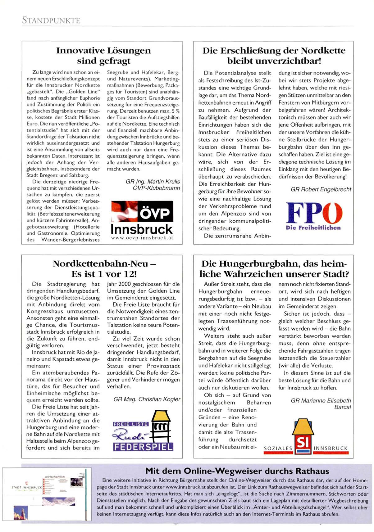 Eine weitere Initiative in Richtung Bürgernähe stellt der Online-Wegweiser durch das Rathaus dar, der auf der Homepage der Stadt Innsbruck unter www.innsbruck.at abzurufen ist. Der Link zum Rathauswegweiser befindet sich auf der Startseite des städtischen Internetauftritts. Hat man sich ,,eingelegt", ist die Suche nach Zimmeniummern, Stichwörter, oder