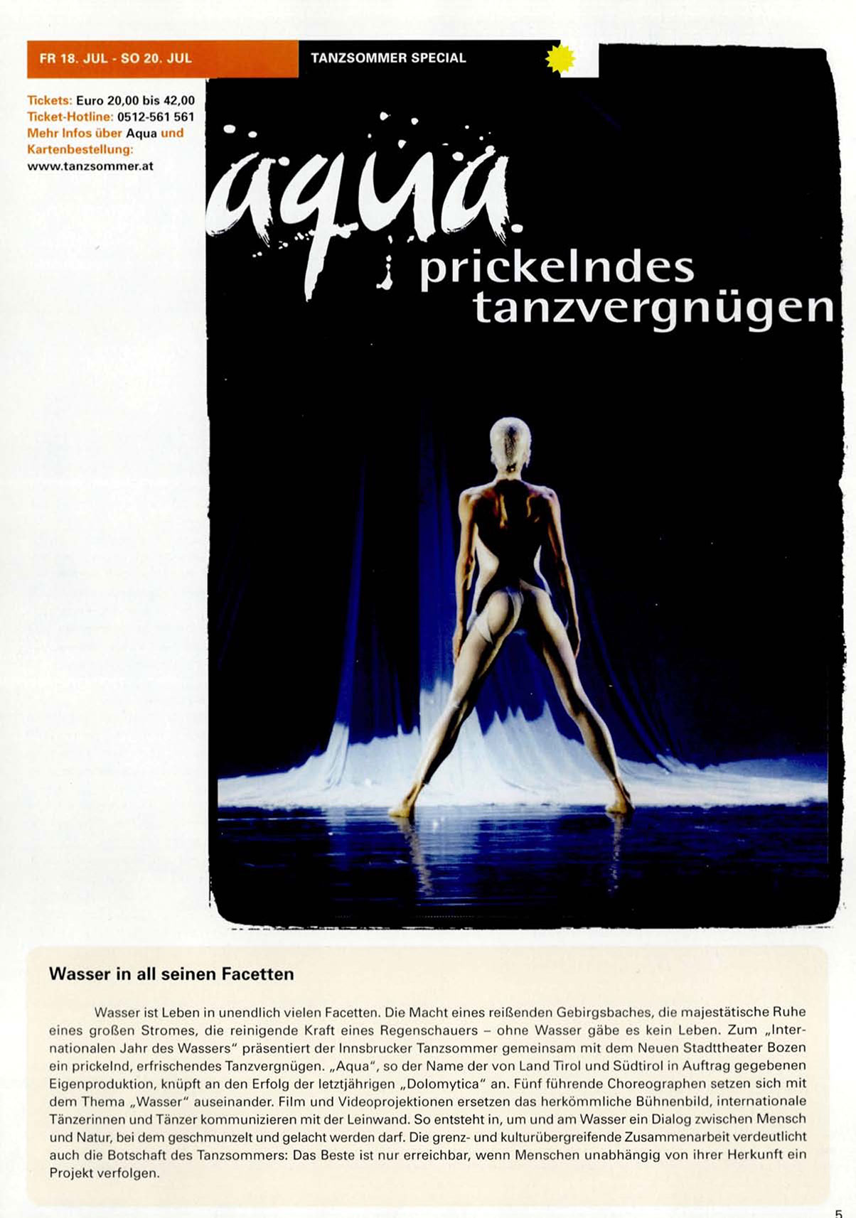 eines g r o ß e n S t r o m e s , die reinigende Kraft eines Regenschauers - ohne Wasser gäbe es kein Leben. Z u m „Internationalen Jahr des Wassers" präsentiert der Innsbrucker Tanzsommer g e m e i n s a m m i t dem Neuen Stadttheater Bozen