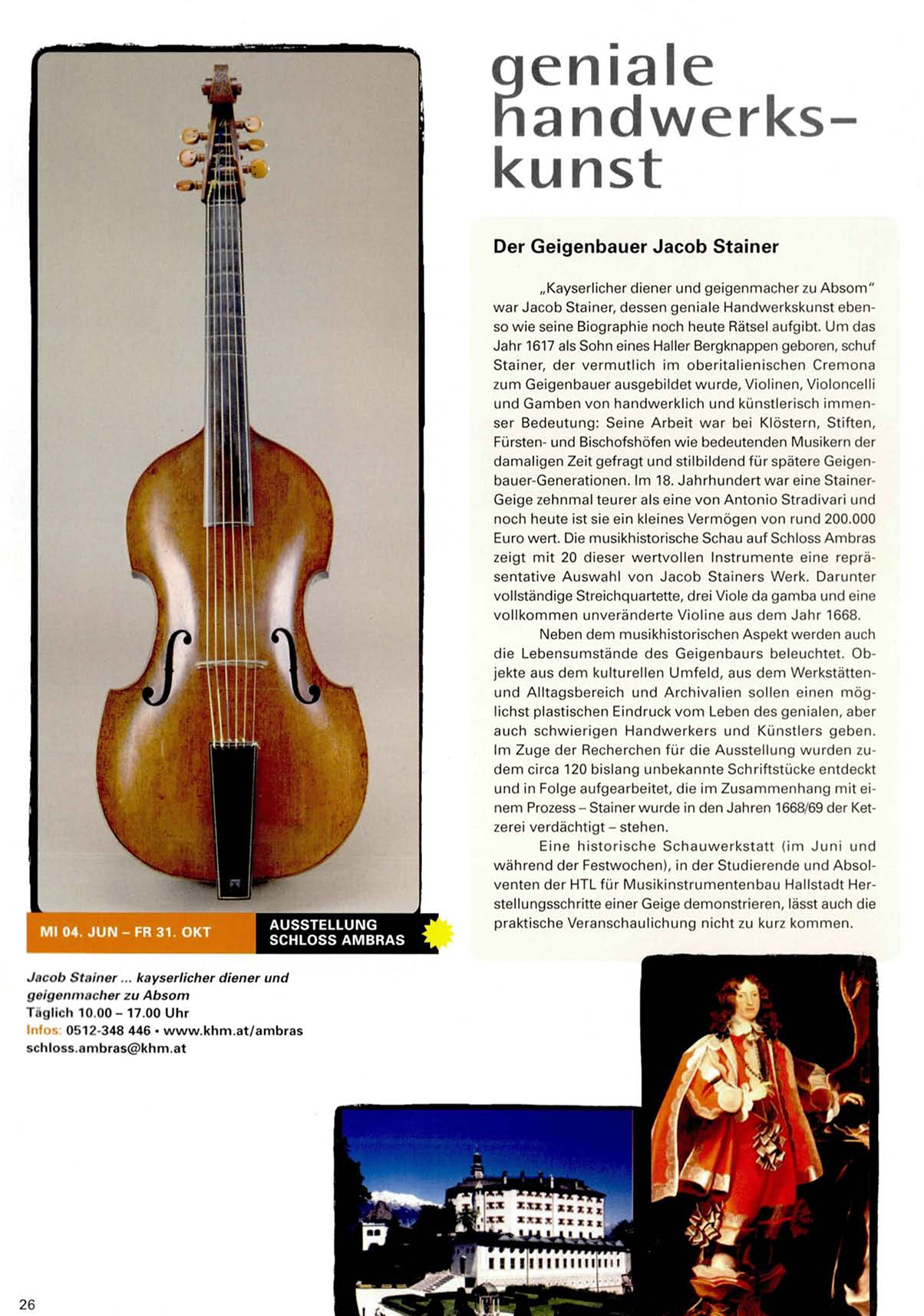 zeigt mit 20 dieser w e r t v o l l e n Instrumente eine repräsentative A u s w a h l von Jacob Stainers Werk. Darunter