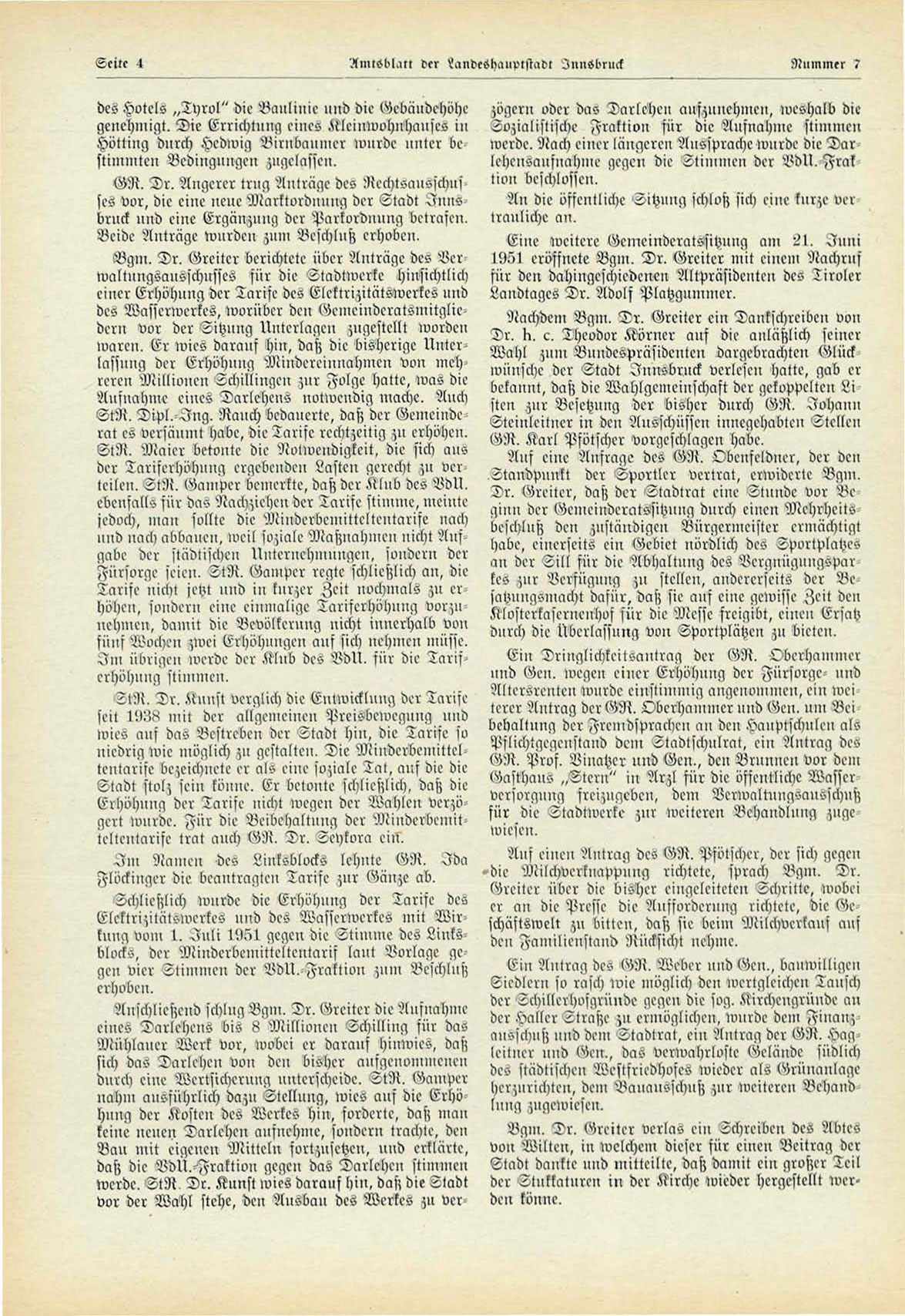 Elektrizitätswerkes und des Wasserwerkes mit Wirkung vom 1. J u l i 1951 gegen die Stimme des Linksblocks, der Minderbemitteltentarif lant Vorlage gegen vier Stimmen der VdU.-Fraktion znm Beschluß