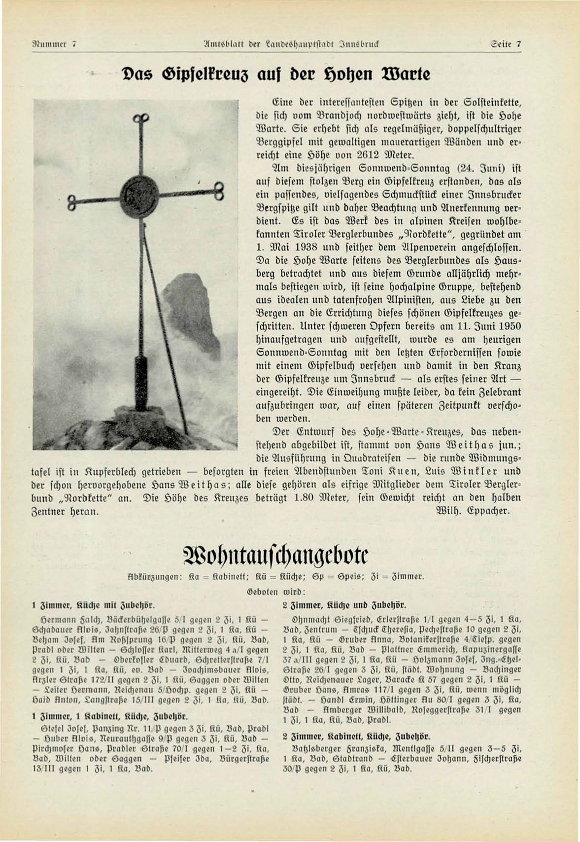 der schon hervorgehobene Hans W e i t h a s ; alle diese gehören als eifrige Mitglieder dein Tiroler Berglerbund „Nordkette" an. Die Höhe des Kreuzes beträgt 1.80 Meter, sein Gewicht reicht an den halben