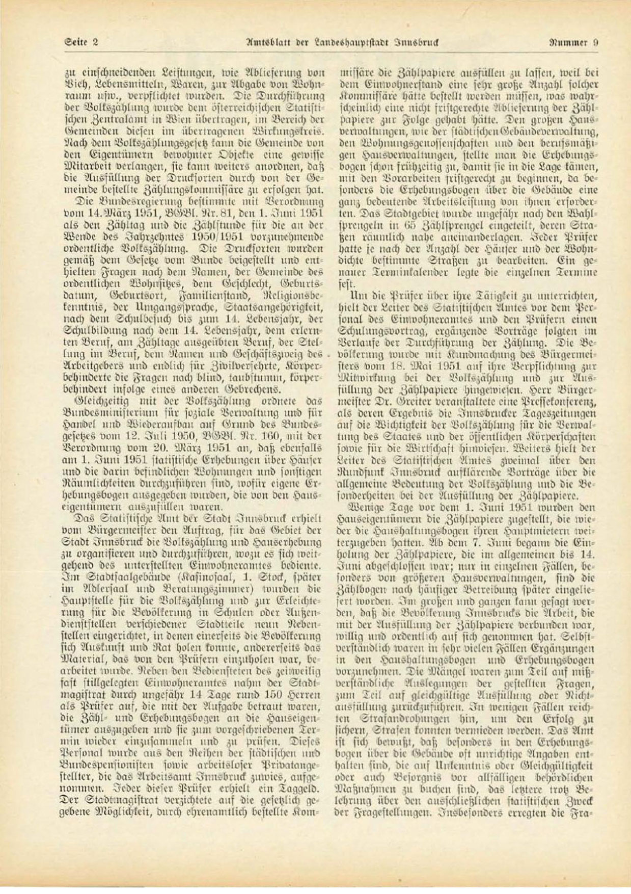 folgten im Verlaufe der Durchführung der Zählung. Die Bevölkerung wurde mit Kundmachung des Bürgermei sters vom 18. Mai 1951 auf ihre Verpflichtung zur Mitwirkung bei der Volkszählung