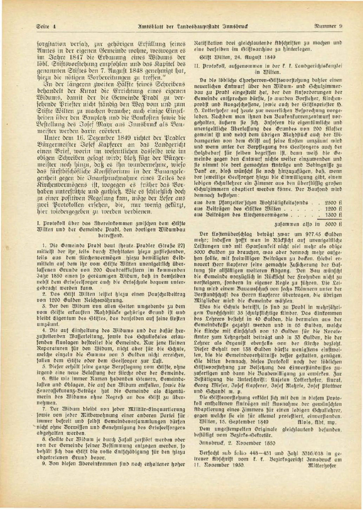 1. Die Gemeinde Pradl baut sheute Pradler Straße 27] mittelst der ihr leils durch Wohltaten hiezu zusließenden, teils aus dem Kirchenvermögen hiezu bewilligten Geldmitteln auf dem ihr vom Stifte