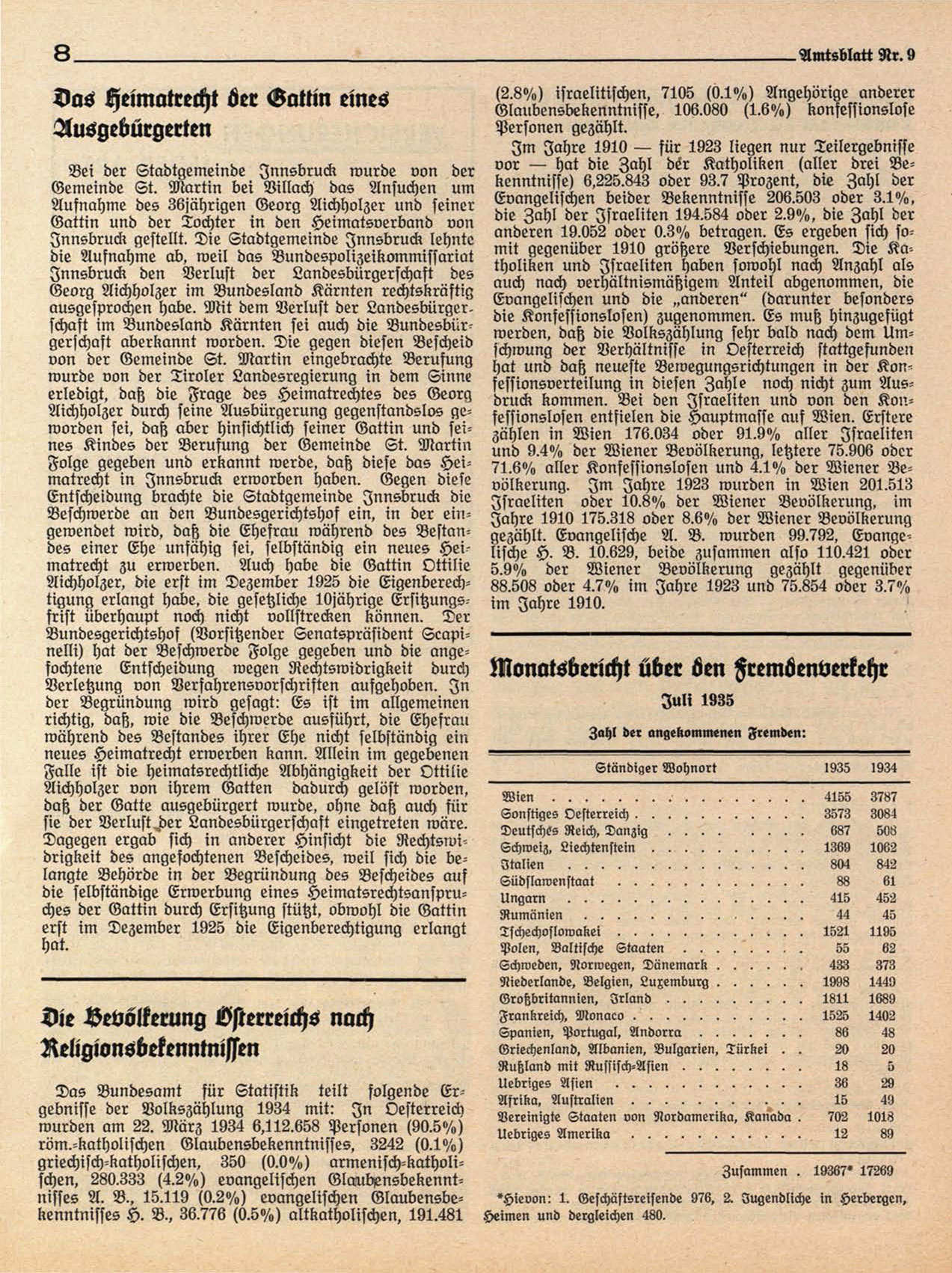 Das Bundesamt für Statistik teilt folgende Ergebnisse der Volkszählung 1934 mit: I n Oesterreich
