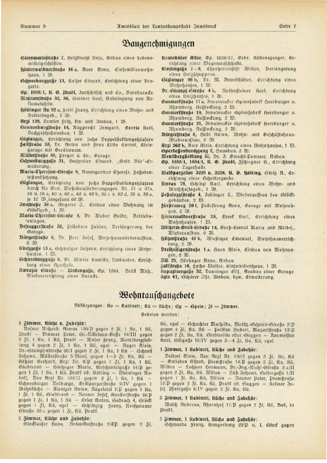Bettori Hlois, Neu Arzi Nr. 160/I gegen 3 Ji, Ra, Rü Gutleben Alfred, Premstraße 14/P gegen 2 öi, Ka, Rü, Wilten — Lechner Hermann, Dr.=Ing.=Riehl-Straße 2a/11 gegen 2 Zi. Ka, Rü, Wilten —