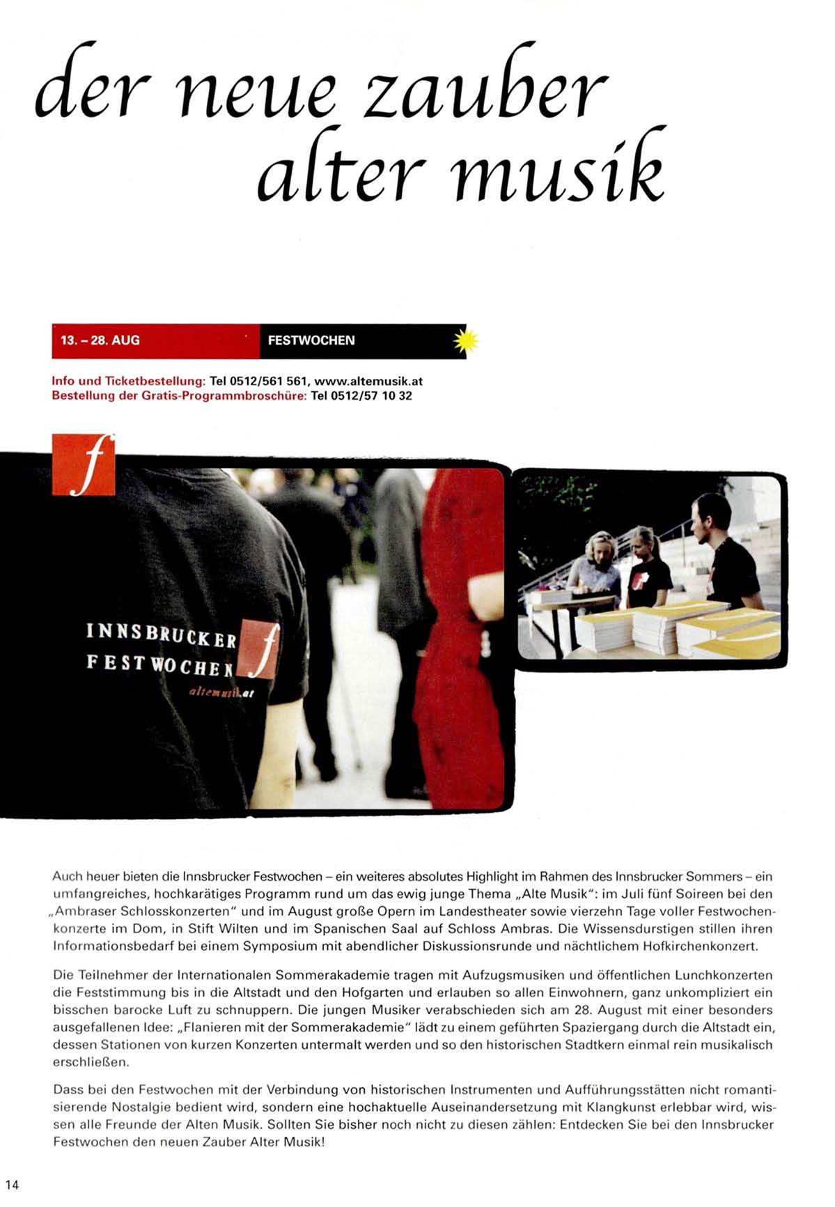 „ A m b r a s e r S c h l o s s k o n z e r t e n " und im A u g u s t g r o ß e Opern im Landestheater sowie vierzehn Tage voller Festwochenkonzerte i m D o m , in Stift Wüten und im Spanischen Saal auf Schloss A m b r a s . Die Wissensdurstigen stillen ihren