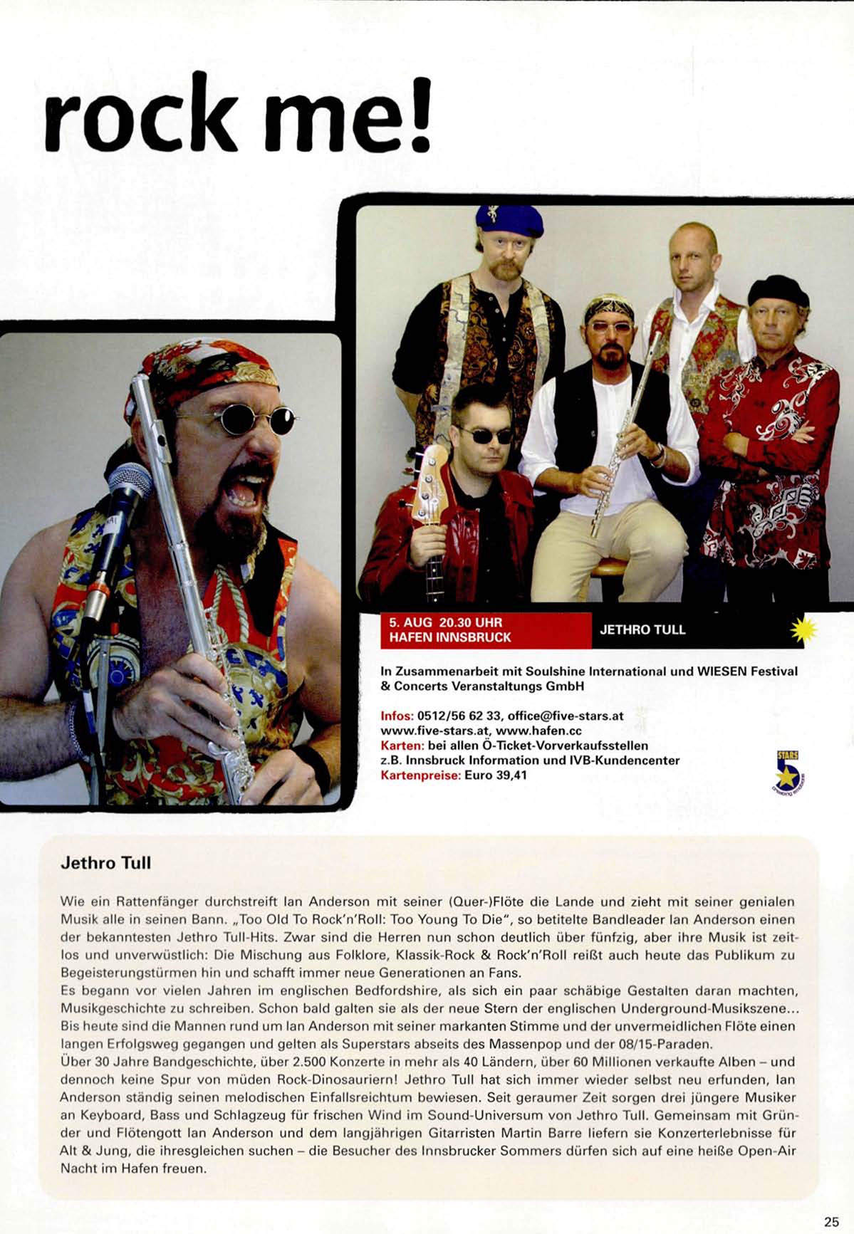 der bekanntesten J e t h r o Tull-Hits. Zwar sind die Herren nun schon deutlich über f ü n f z i g , aber ihre Musik ist zeitlos und u n v e r w ü s t l i c h : Die M i s c h u n g aus Folklore, Klassik-Rock & Rock"n"Roll reißt auch heute das P u b l i k u m zu