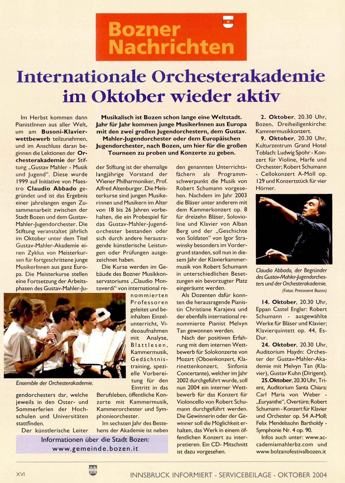 Stadt Bozen und dem GustavMahler-Jugendorchester. Die