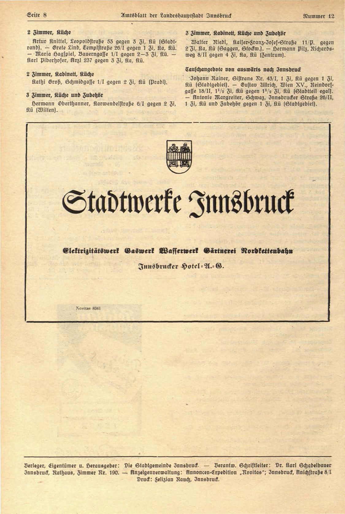 Verleger, Eigentümer u. Herausgeber: Vie Stadtgemeinde Innsbruck. — Verantw. Schriftleiter: Vr. Karl Ochadelbauer