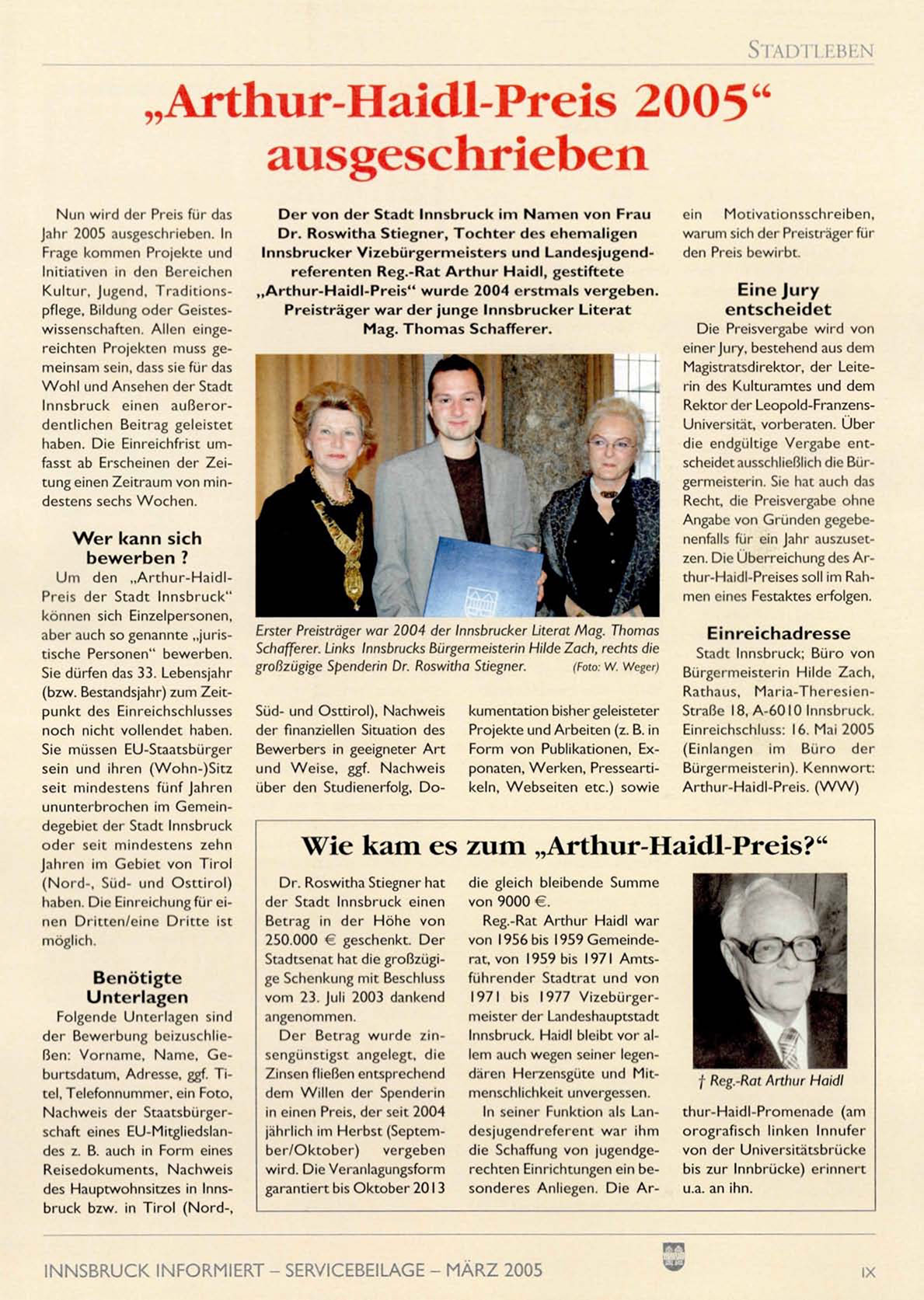 „ A r t h u r - H a i d l - P r e i s " w u r d e 2004 erstmals vergeben.