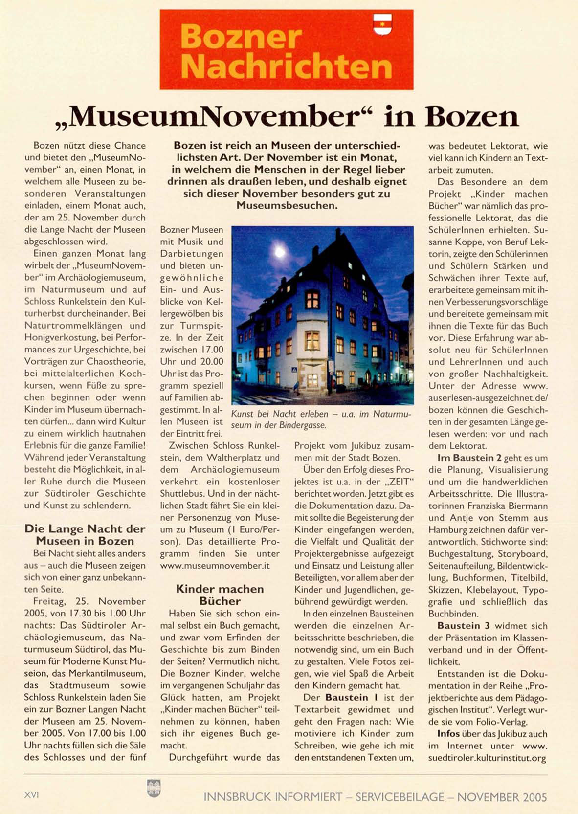 B o z e n ist reich an M u s e e n d e r u n t e r s c h i e d lichsten A r t . D e r N o v e m b e r ist ein M o n a t ,