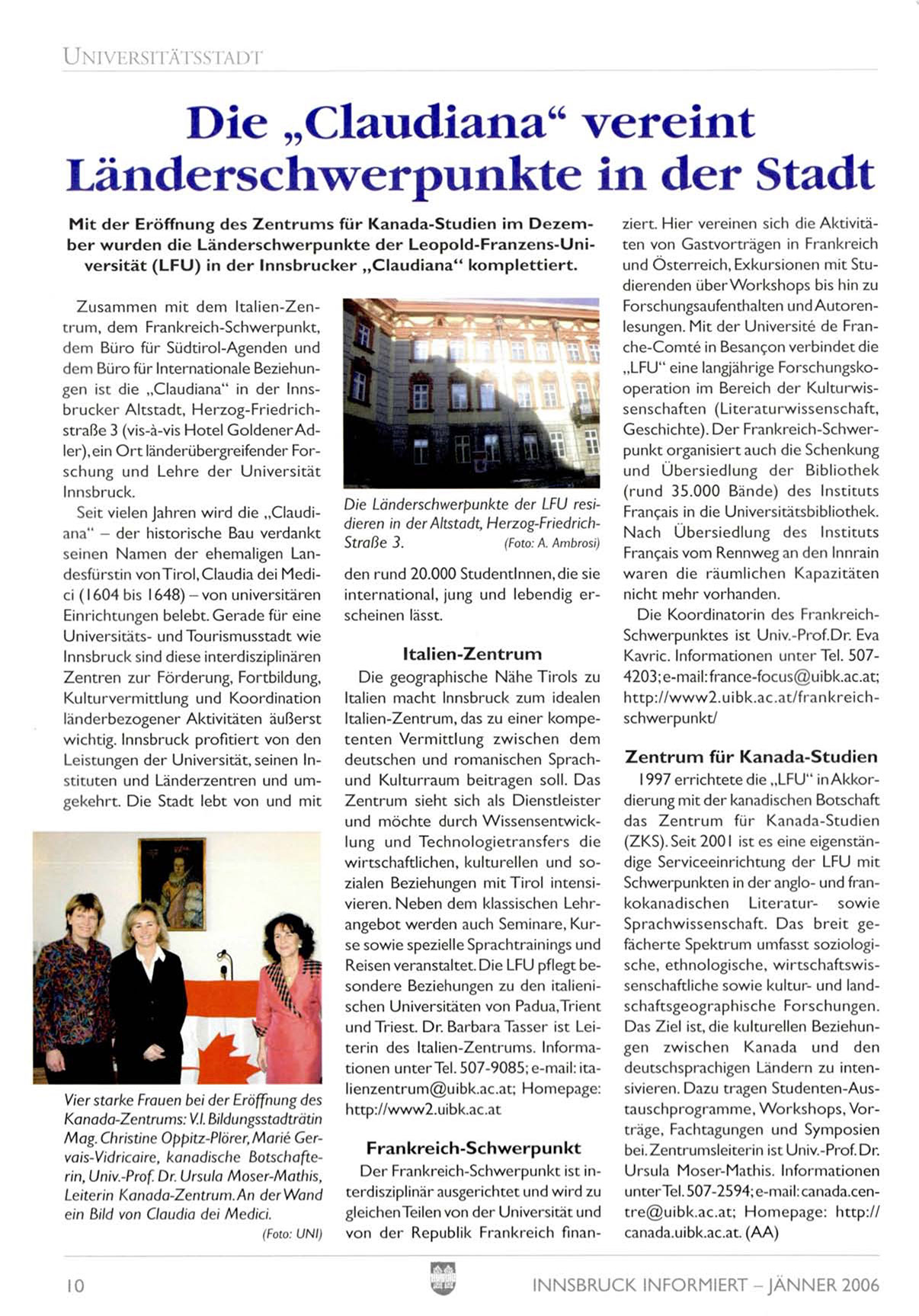 M i t d e r E r ö f f n u n g des Z e n t r u m s f ü r K a n a d a - S t u d i e n i m D e z e m ber w u r d e n die L ä n d e r s c h w e r p u n k t e der Leopold-Franzens-Uni