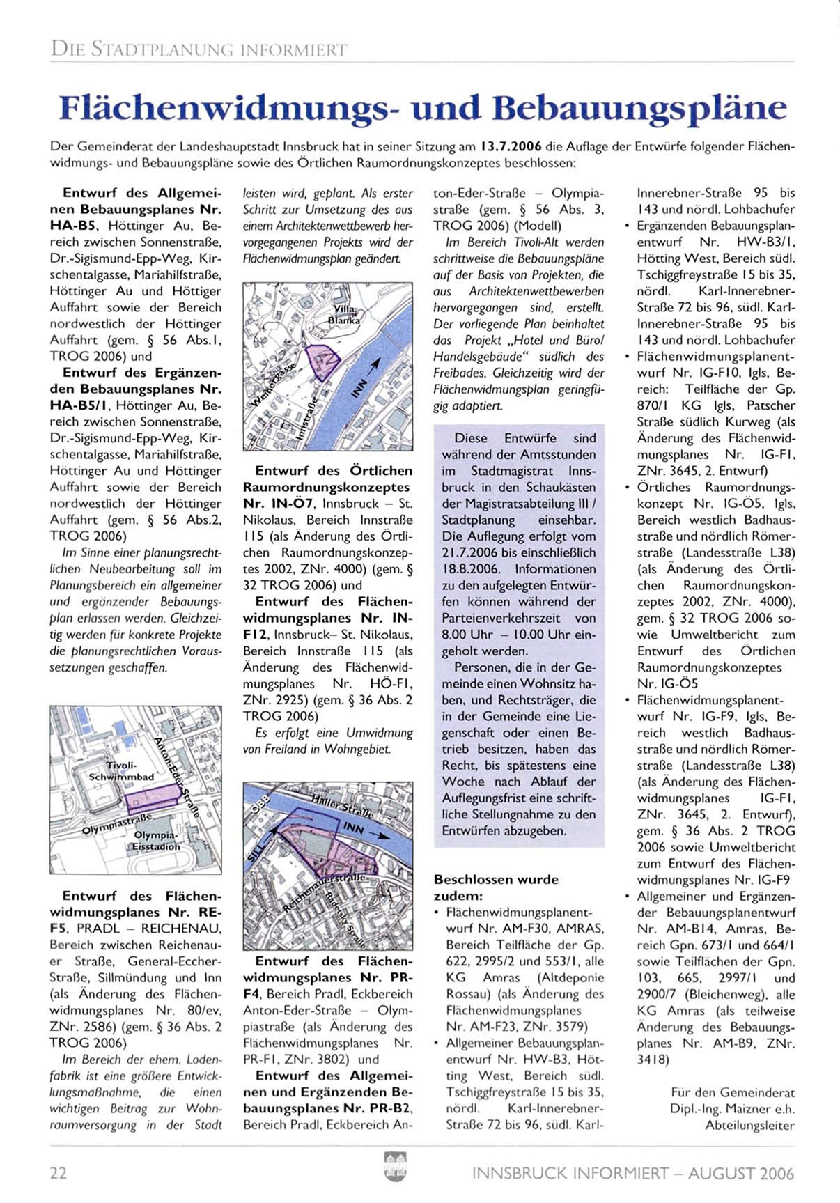 Der Gemeinderat der Landeshauptstadt Innsbruck hat in seiner Sitzung am I 3.7.2006 die Auflage der Entwürfe folgender Flachenwidmungs- und Bebauungspläne sowie des Örtlichen Raumordnungskonzeptes beschlossen: