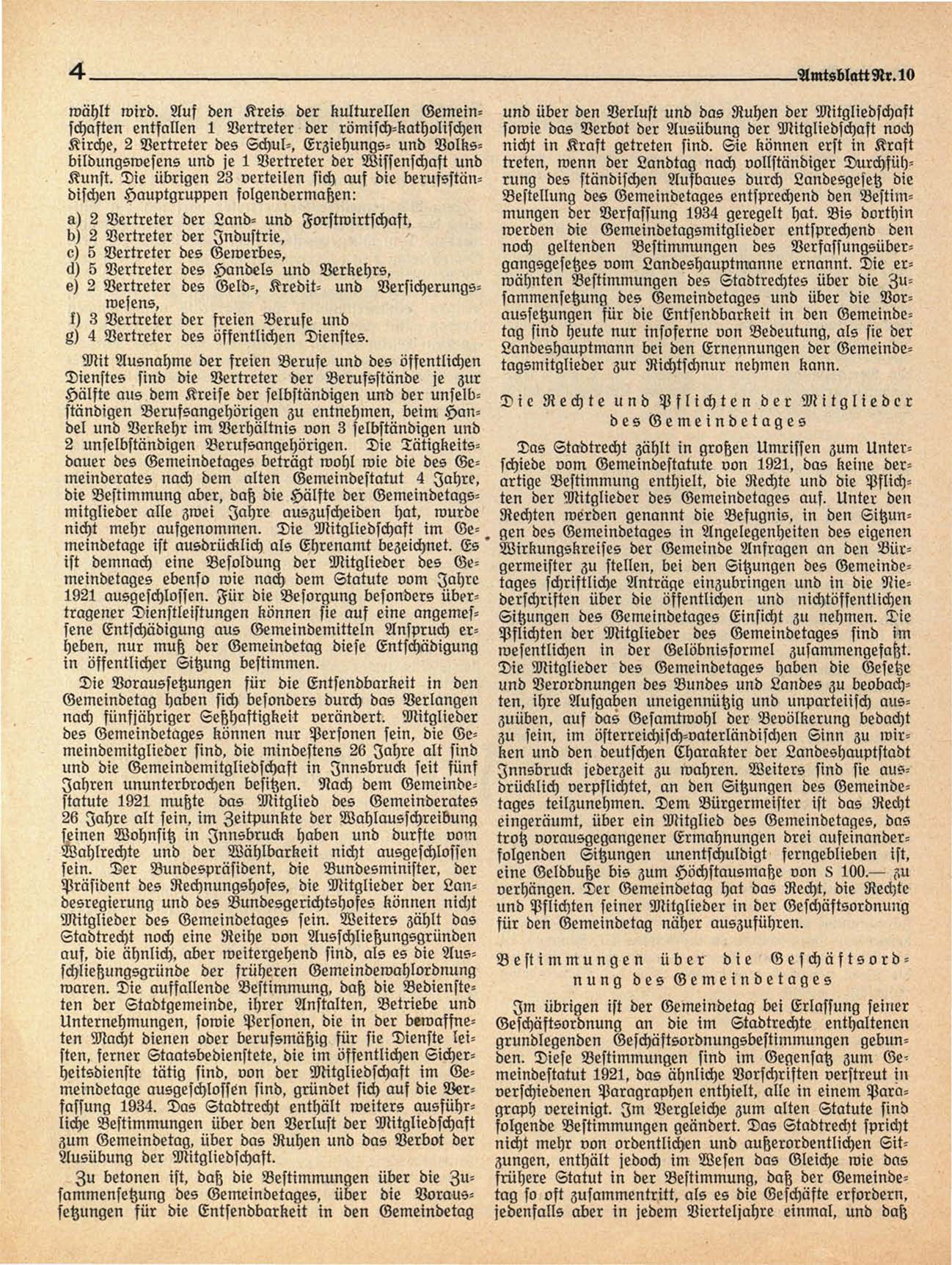 Unternehmungen, sowie Personen, die in der bewaffneten Macht dienen oder berufsmäßig für sie Dienste leisten, ferner Staatsbedienstete, die im öffentlichen Sicherheitsdienste tätig sind, von der Mitgliedschaft im Gemeindetage ausgeschlossen sind, gründet sich auf die Verfassung 1934. Das Stadtrecht enthält weiters ausführliche Bestimmungen über den Verlust der Mitgliedschaft