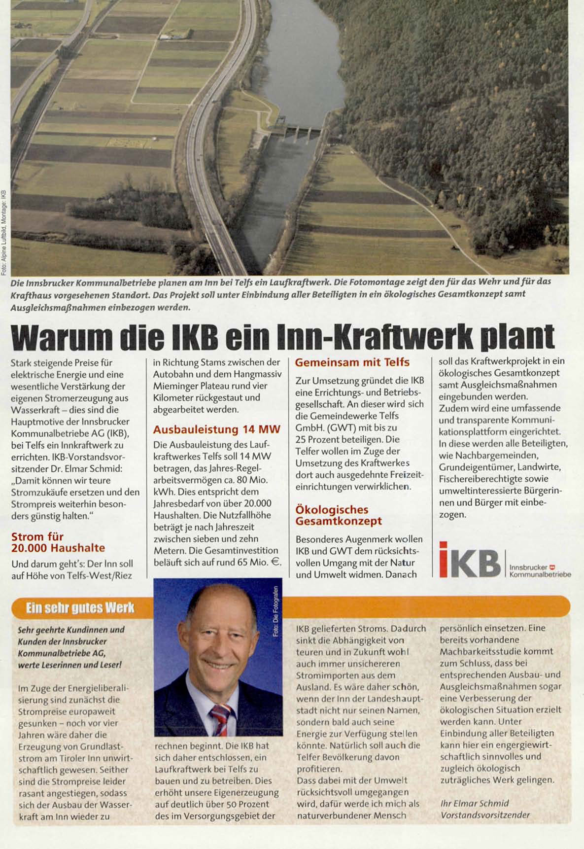 Die Ausbauleistung des Laufkraftwerkes Telfs soll 14 M W