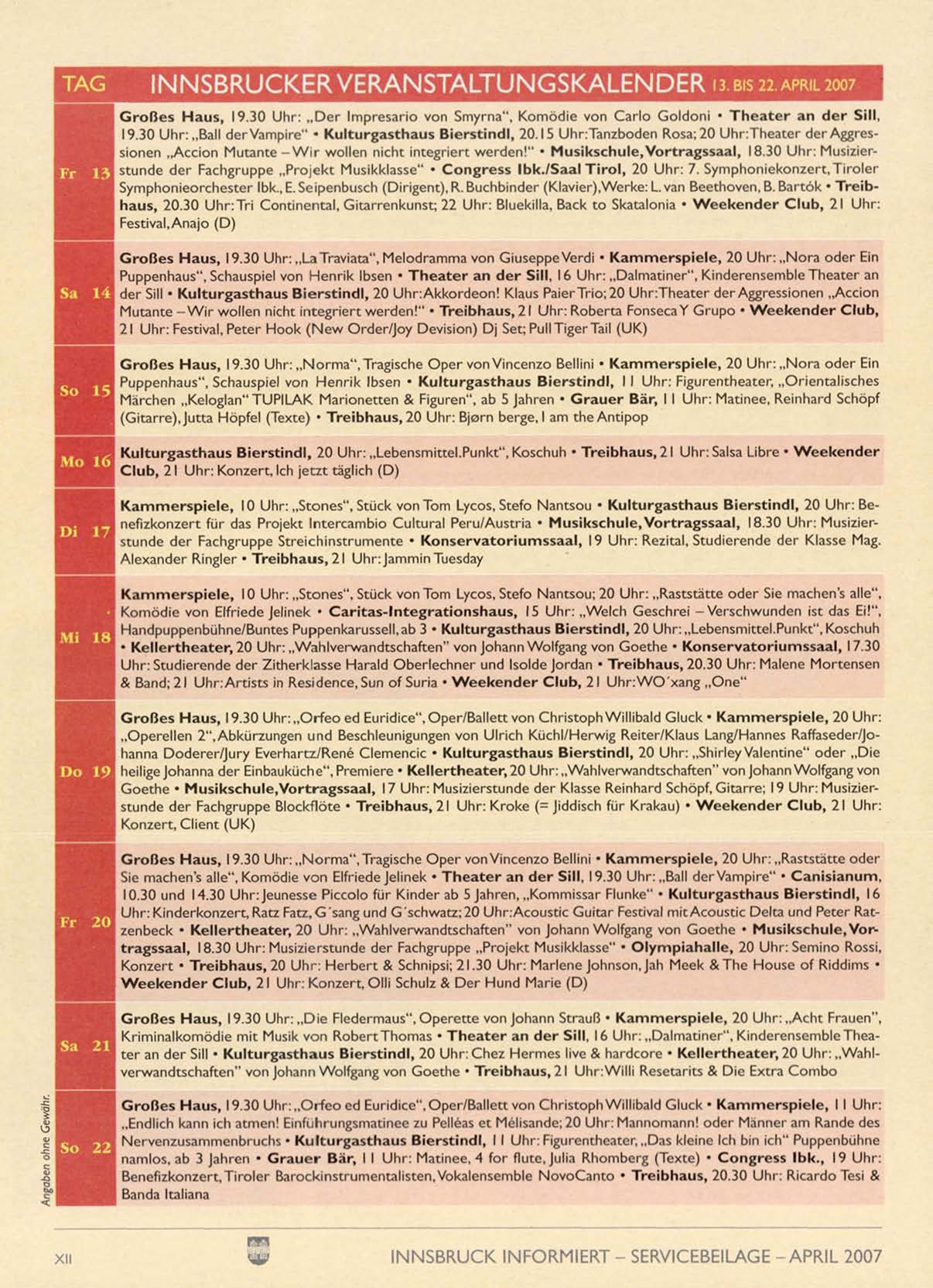 INNSBRUCKER VERANSTALTUNGSKALENDER 13. BIS 22.APRILIOO;