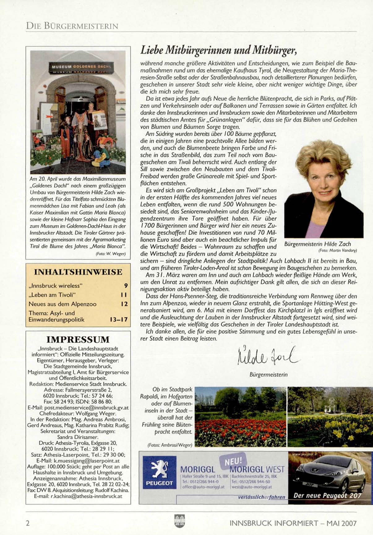 Inn zum Alpenzoo, wieder in neuem Glanz erstrahlt, die Sportanlage Hötting-West generalsaniert wird, am 6. Mai mit einem Dorffest das Kirchplatzl in Igls eröffnet wird