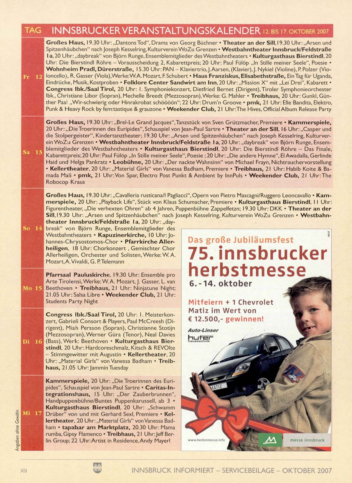 INNSBRUCKER VERANSTALTUNGSKALENDER 12. BIS 17. OKTOBER 2007